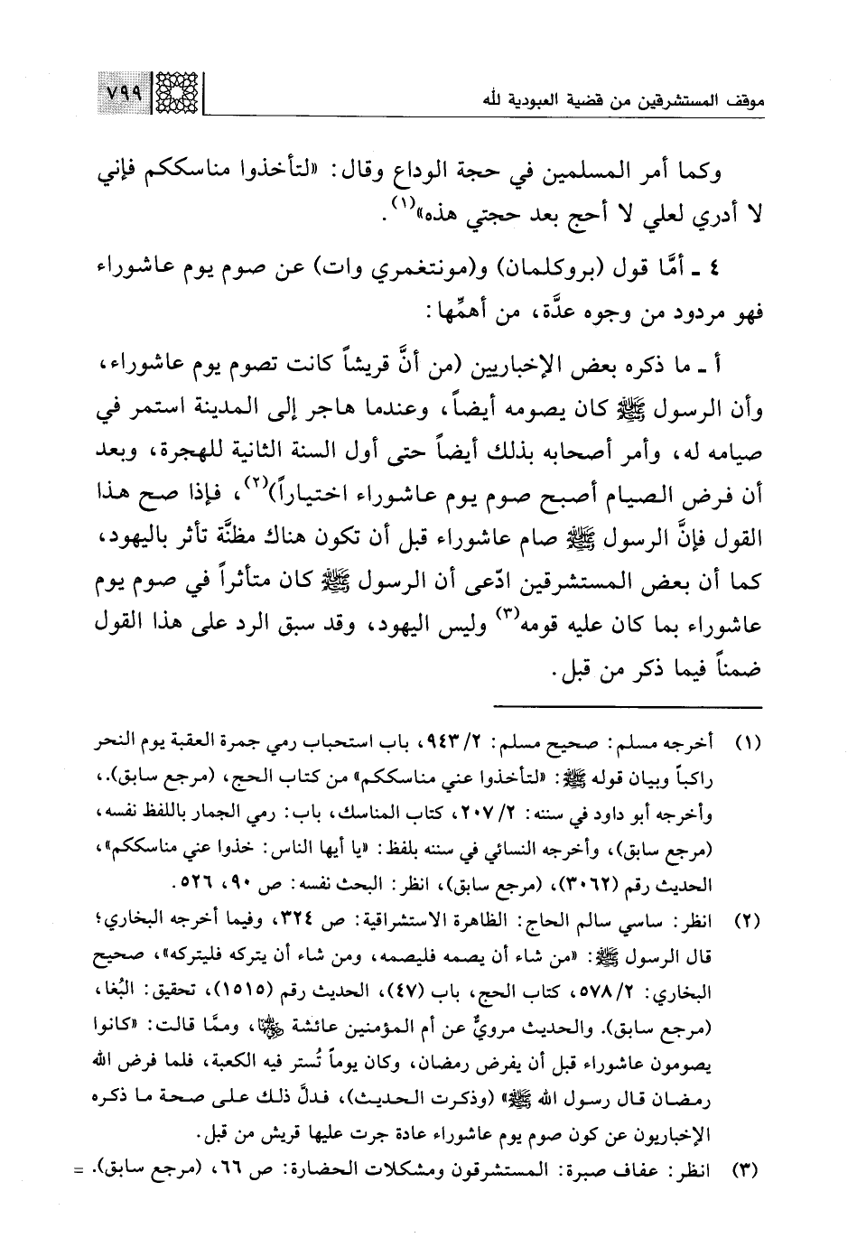 4 - أمَّا قول (بروكلمان) و (مونتغمري وات) عن صوم يوم عاشوراء فهو مردود من وجوه عدَّة، من أهمِّها: