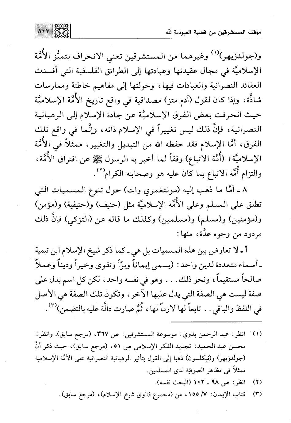 و (جولدزيهر) (¬1) وغيرهما من المستشرقين تعني الانحراف بتميُّز الأُمَّة الإسلاميَّة في مجال عقيدتها وعبادتها إلى الطرائق الفلسفية التي أفسدت العقائد النصرانية والعبادات فيها، وحولتها إلى مفاهيم خاطئة وممارسات شاذَّة، وإذا كان لقول (آدم متز) مصداقية في واقع تاريخ الأُمَّة الإسلاميَّة حيث انحرفت بعض الفرق الإسلاميَّة عن جادة الإسلام إلى الرهبانية النصرانية، فإنَّ ذلك ليس تغييرًا في الإسلام ذاته، وإنَّما في واقع تلك الفرق، أمَّا الإسلام فقد حفظه اللَّه من التبديل والتغيير، ممثلًا في الأُمَّة الإسلاميَّة؛ (أُمَّة الاتباع) وفقًا لما أخبر به الرسول -صلى اللَّه عليه وسلم- عن افتراق الأُمَّة، والتزام أُمَّة الاتباع بما كان عليه هو وصحابته الكرام (¬2).