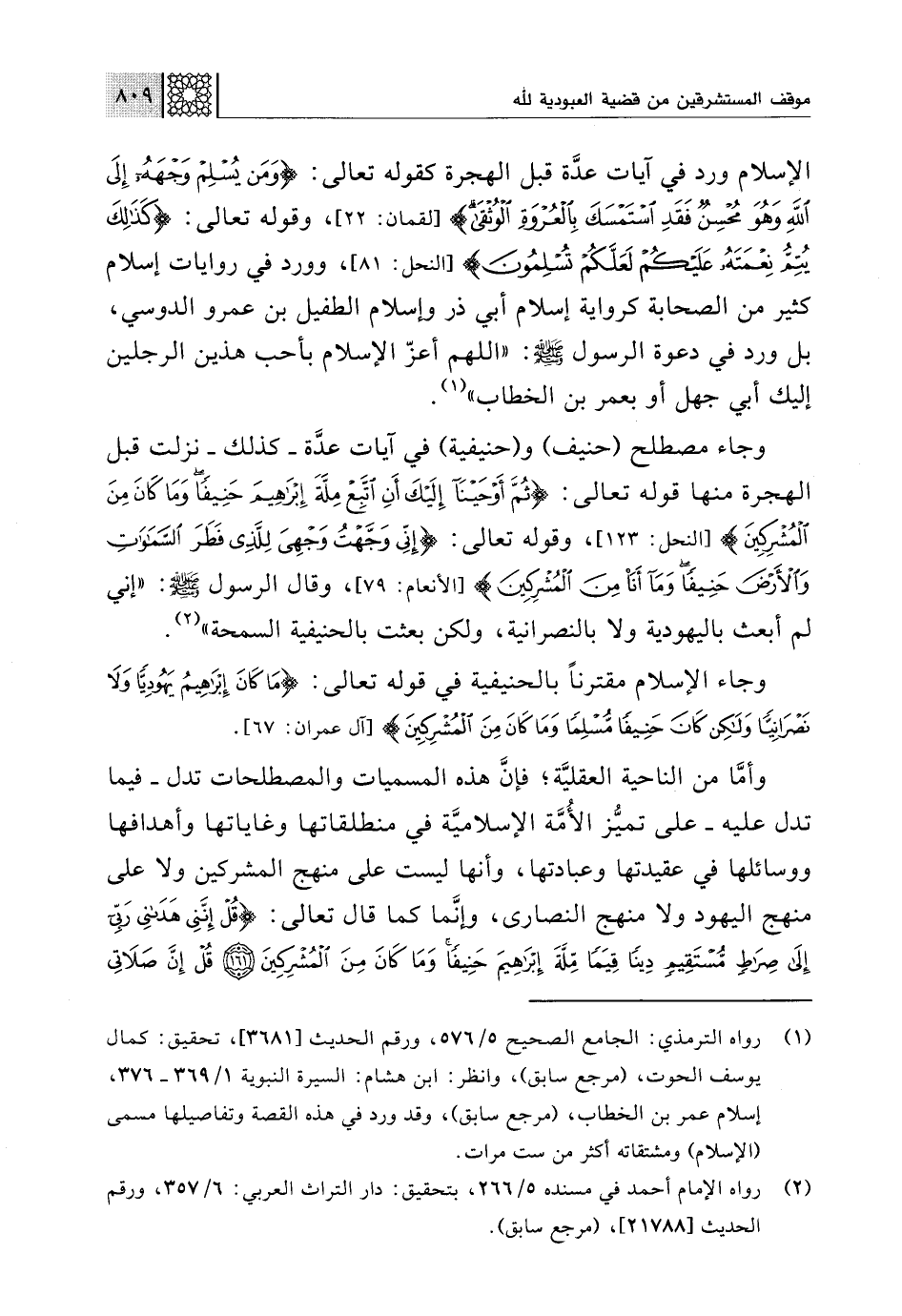 (¬1) رواه الترمذي: الجامع الصحيح 5/ 576، ورقم الحديث [3681]، تحقيق: كمال يوسف الحوت، (مرجع سابق)، وانظر: ابن هشام: السيرة النبوية 1/ 369 - 376، إسلام عمر بن الخطاب، (مرجع سابق)، وقد ورد في هذه القصة وتفاصيلها مسمى (الإسلام) ومشتقاته أكثر من ست مرات.