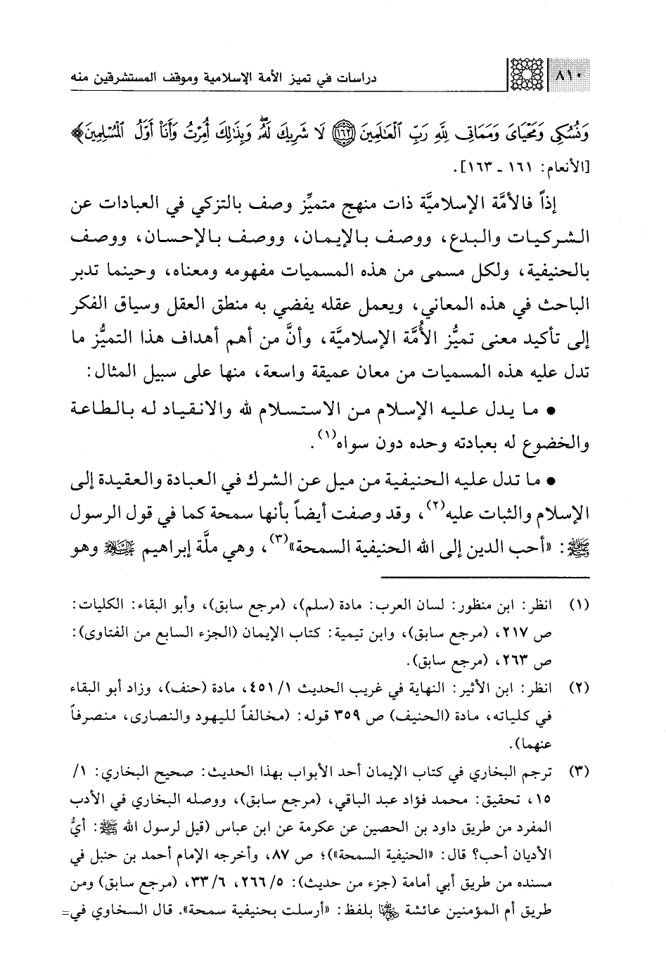 (¬2) انظر: ابن الأثير: النهاية في غريب الحديث 1/ 451، مادة (حنف)، وزاد أبو البقاء في كلياته، مادة (الحنيف) ص 359 قوله: (مخالفًا لليهود والنصارى، منصرفًا عنهما).
