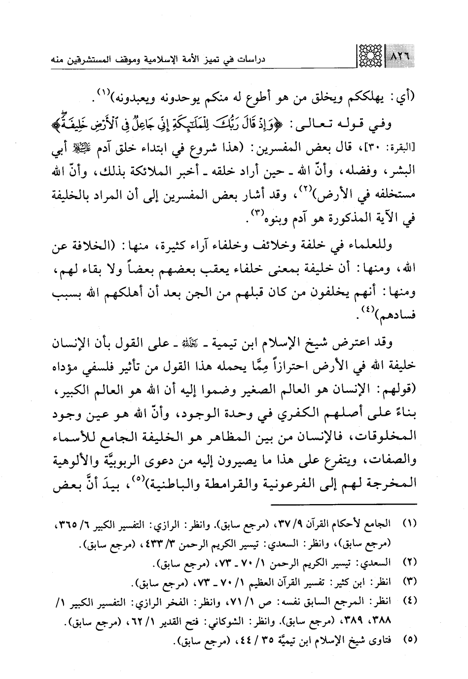 وقد اعترض شيخ الإسلام ابن تيمية -رحمه اللَّه- على القول بأن الإنسان خليفة اللَّه في الأرض احترازًا مِمَّا يحمله هذا القول من تأثير فلسفي مؤداه (قولهم: الإنسان هو العالم الصغير وضموا إليه أن اللَّه هو العالم الكبير، بناءً على أصلهم الكفري في وحدة الوجود، وأنّ اللَّه هو عين وجود المخلوقات، فالإنسان من بين المظاهر هو الخليفة الجامع للأسماء والصفات، ويتفرع على هذا ما يصيرون إليه من دعوى الربوبيَّة والألوهية المخرجة لهم إلى الفرعونية والقرامطة والباطنية) (¬5)، بيدَ أنَّ بعض