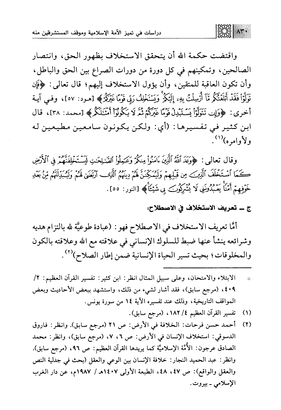 (¬2) أحمد حسن فرحات: الخلافة في الأرض: ص 21 (مرجع سابق). وانظر: فاروق الدسوقي: استخلاف الإنسان في الأرض: ص 6، 7، (مرجع سابق)، وانظر: محمد الصادق عرجون: الأُمَّة الإسلاميَّة كما يريدها القرآن العظيم: ص 96، (مرجع سابق). وانظر: عبد الحميد النجار: خلافة الإنسان بين الوعي والعقل (بحث في جدلية النص والعقل والواقع): ص 47، 48، الطبعة الأولى 1407 هـ - 1987 م، عن دار الغرب الإسلامي - بيروت.