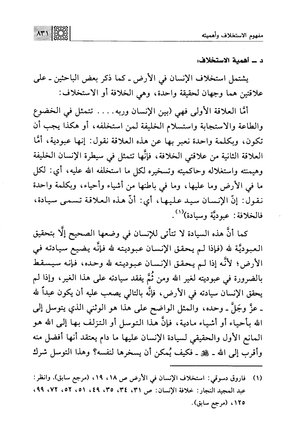 (¬1) فاروق دسوقي: استخلاف الإنسان في الأرض ص 18، 19، (مرجع سابق). وانظر: عبد المجيد النجار: خلافة الإنسان: ص 31، 34، 35، 49، 51، 52، 72، 99، 125، (مرجع سابق).