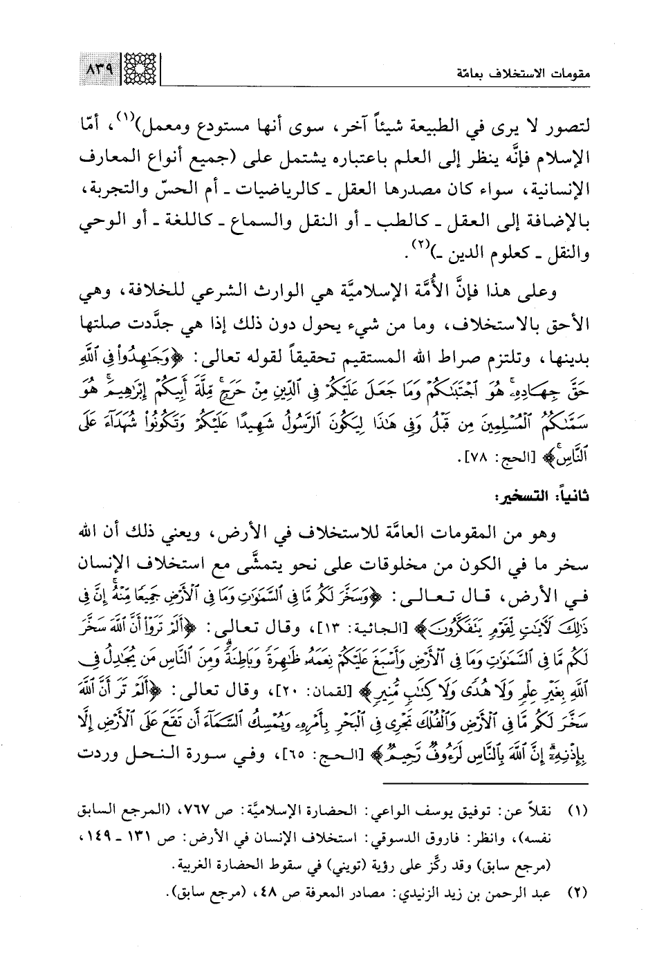 (¬1) نقلًا عن: توفيق يوسف الواعي: الحضارة الإسلامية: ص 767، (المرجع السابق نفسه)، وانظرت فاروف الدسوقي: استخلاف الإنسان في الأرض: ص 131 - 149، (مرجع سابق) وقد ركَّز على رؤية (تويني) في سقوط الحضارة الغربية.