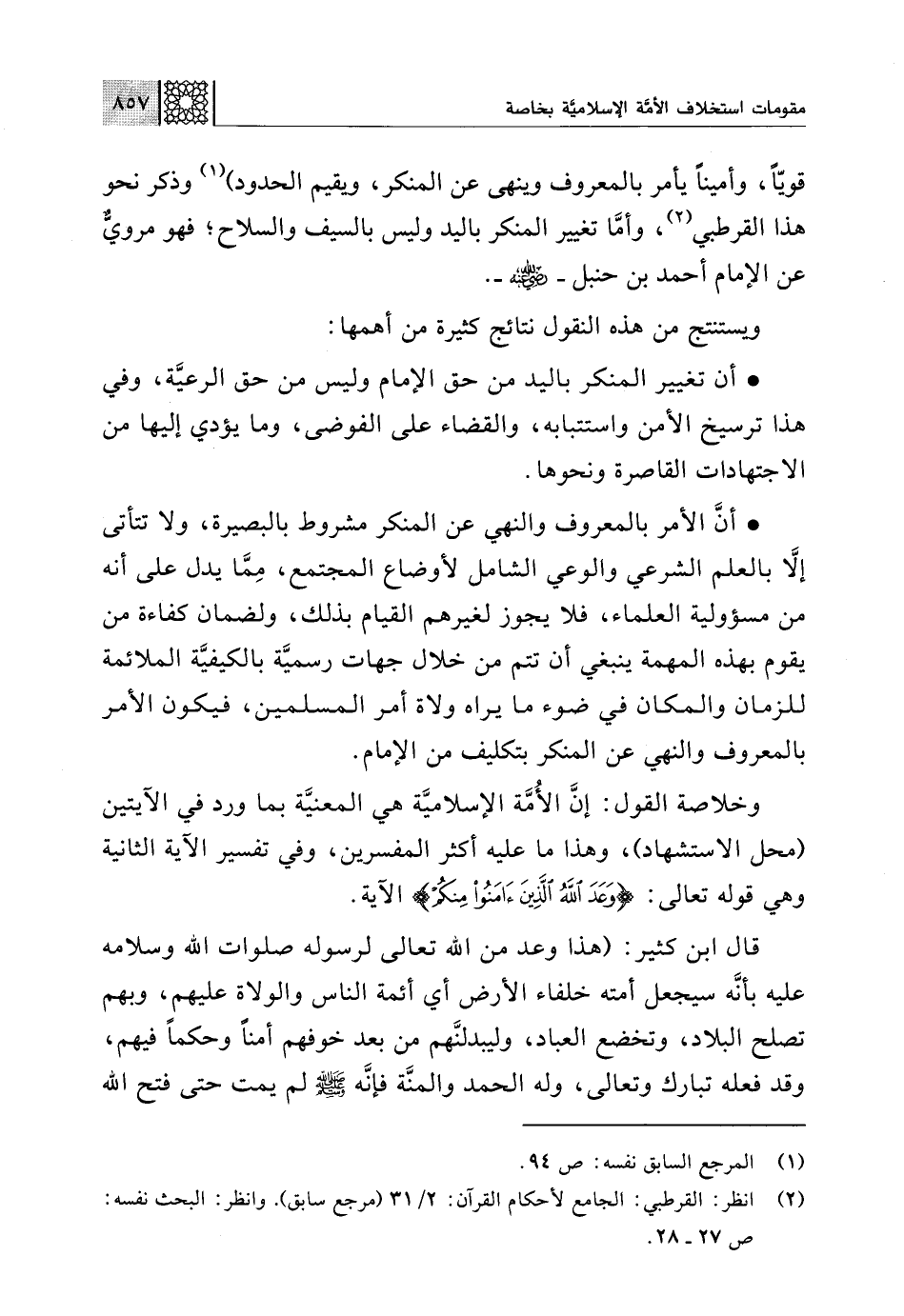 قويًّا، وأمينًا يأمر بالمعروف وينهى عن المنكر، ويقيم الحدود) (¬1) وذكر نحو هذا القرطبي (¬2)، وأمَّا تغيير المنكر باليد وليس بالسيف والسلاح؛ فهو مرويٌّ عن الإمام أحمد بن حنبل -رضي اللَّه عنه-.
