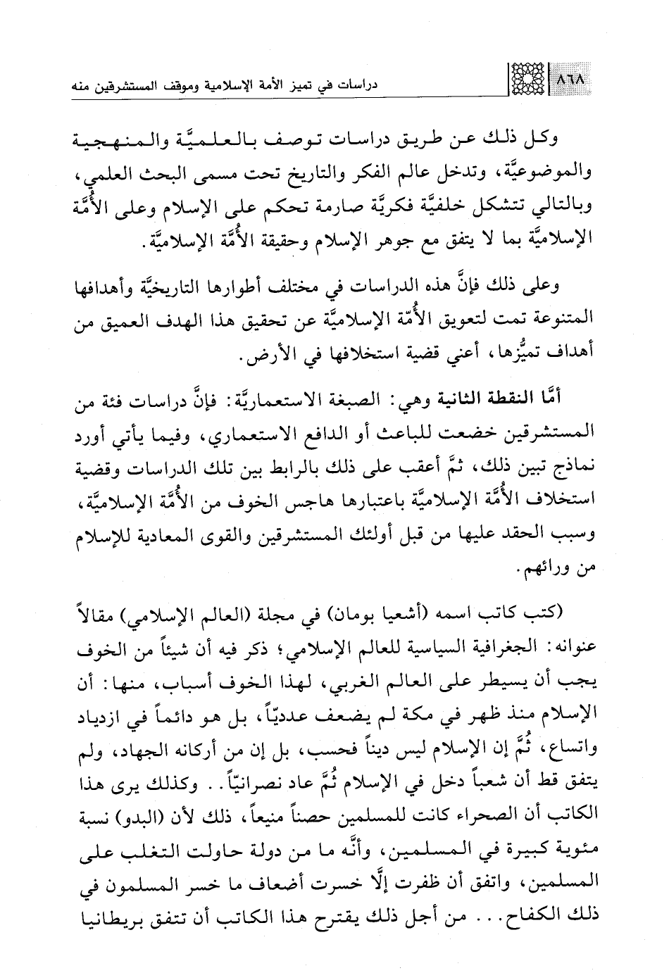 (كتب كاتب اسمه (أشعيا بومان) في مجلة (العالم الإسلامي) مقالًا عنوانه: الجغرافية السياسية للعالم الإسلامي؛ ذكر فيه أن شيئًا من الخوف يجب أن يسيطر على العالم الغربي، لهذا الخوف أسباب، منها: أن الإسلام منذ ظهر في مكة لم يضعف عدديًّا، بل هو دائمًا في ازدياد واتساع، ثُمَّ إن الإسلام ليس دينًا فحسب، بل إن من أركانه الجهاد، ولم يتفق قط أن شعبًا دخل في الإسلام ثُمَّ عاد نصرانيًّا. . وكذلك يرى هذا الكاتب أن الصحراء كانت للمسلمين حصنًا منيعًا، ذلك لأن (البدو) نسبة مئوية كبيرة في المسلمين، وأنَّه ما من دولة حاولت التغلب على المسلمين، واتفق أن ظفرت إلَّا خسرت أضعاف ما خسر المسلمون في ذلك الكفاح. . . من أجل ذلك يقترح هذا الكاتب أن تتفق بريطانيا