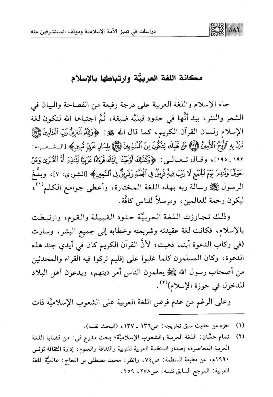 (¬2) تمام حسَّان: اللغة العربية والشعوب الإسلاميَّة؛ بحث مدرج في: من قضايا اللغة العربية المعاصرة، إصدار المنظمة العربية للتربية والثقافة والعلوم، إدارة الثقافة تونىس 1990 م، عن مطبعة المنظمة: ص 74، وانظر: محمد مصطفى بن الحاج: عالميَّة اللغة العربية: المرجع السابق نفسه: ص 258، 259.