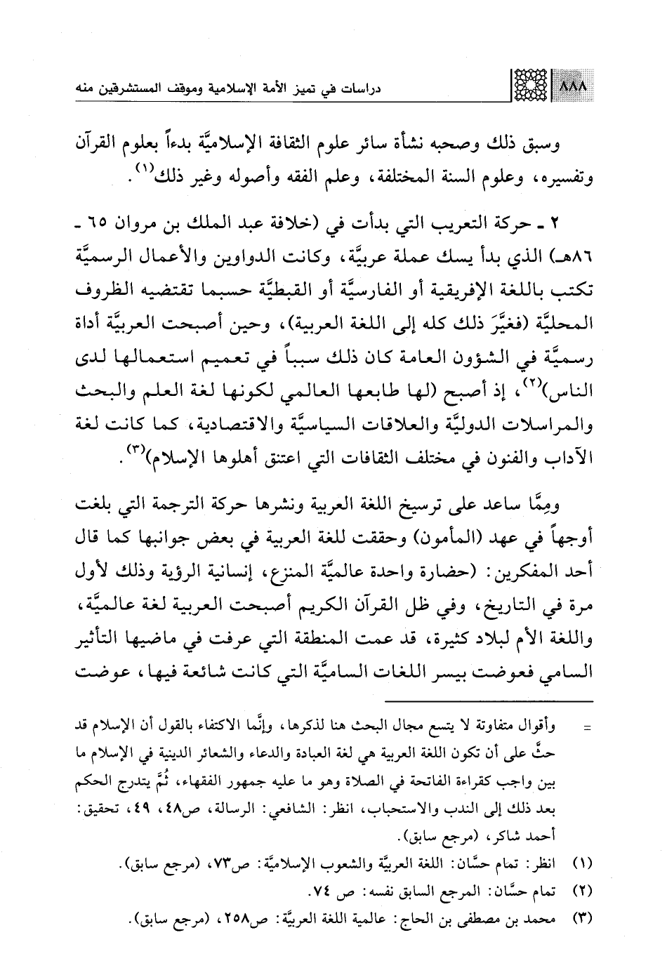 (¬1) انظر: تمام حسَّان: اللغة العربية والشعوب الإسلاميَّة: ص 73، (مرجع سابق).