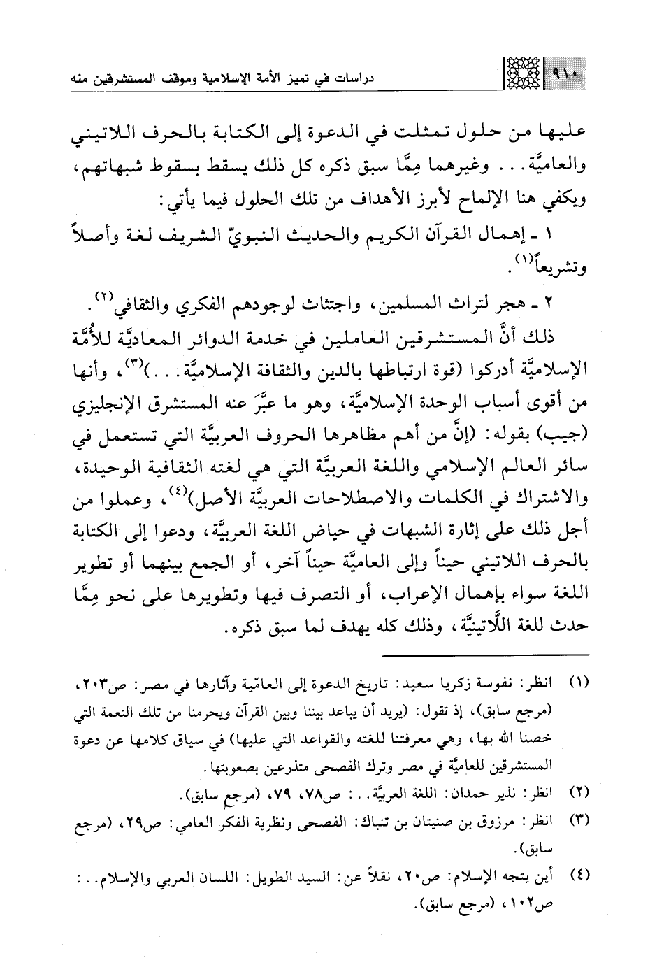 ذلك أنَّ المستشرقين العاملين في خدمة الدوائر المعاديَّة للأُمَّة الإسلاميَّة أدركوا (قوة ارتباطها بالدين والثقافة الإسلاميَّة. . .) (¬3)، وأنها من أقوى أسباب الوحدة الإسلاميَّة، وهو ما عبَّرَ عنه المستشرق الإنجليزي (جيب) بقوله: (إنَّ من أهم مظاهرها الحروف العربيَّة التي تستعمل في سائر العالم الإسلامي واللغة العربيَّة التي هي لغته الثقافية الوحيدة، والاشتراك في الكلمات والاصطلاحات العربيَّة الأصل) (¬4)، وعملوا من أجل ذلك على إثارة الشبهات في حياض اللغة العربيَّة، ودعوا إلى الكتابة بالحرف اللاتيني حينًا وإلى العاميَّة حينًا آخر، أو الجمع بينهما أو تطوير اللغة سواء بإهمال الإعراب، أو التصرف فيها وتطويرها على نحو مِمَّا حدث للغة اللَّاتينيَّة، وذلك كله يهدف لما سبق ذكره.