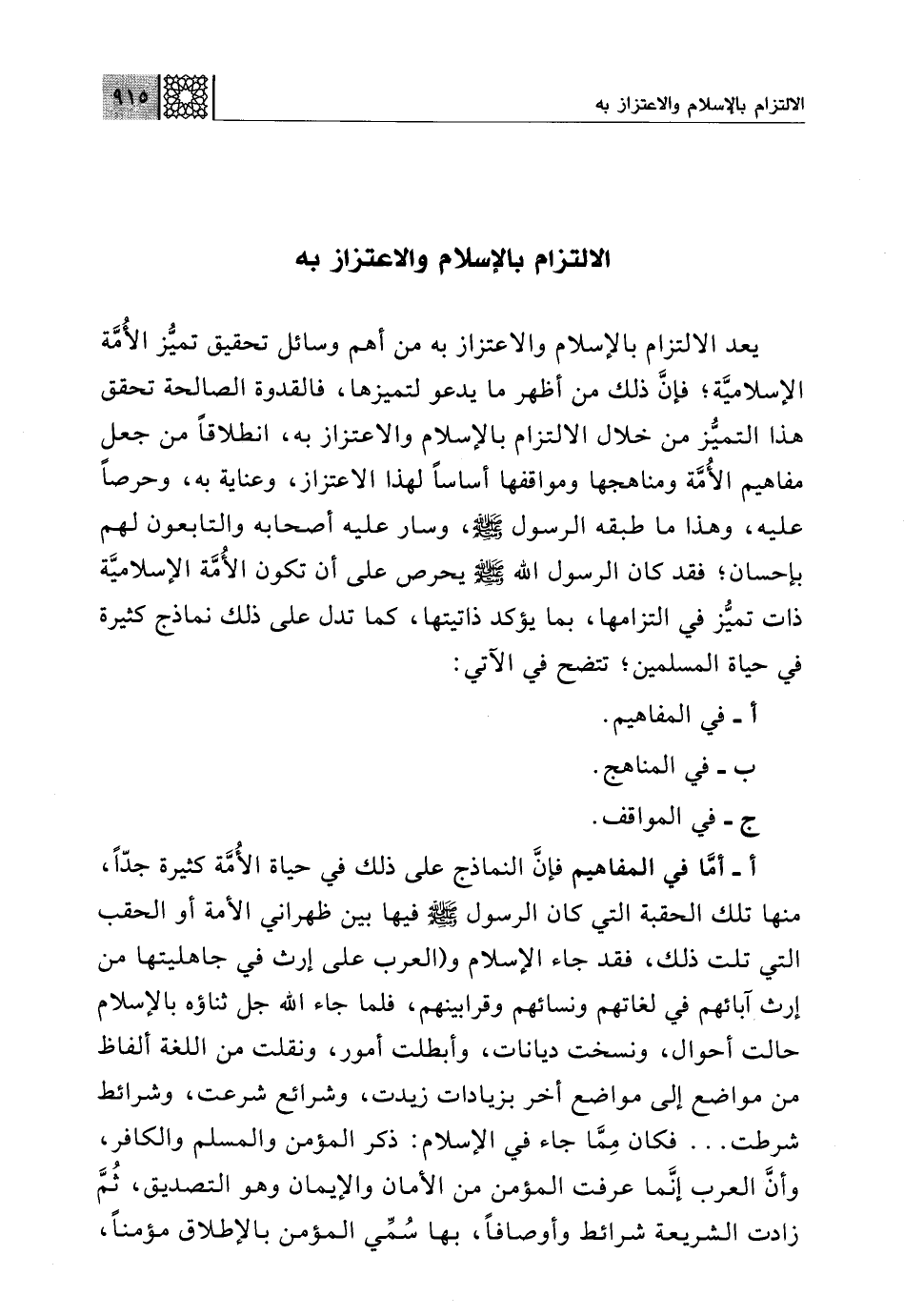 يعد الالتزام بالإسلام والاعتزاز به من أهم وسائل تحقيق تميُّز الأُمَّة الإسلاميَّة؛ فإنَّ ذلك من أظهر ما يدعو لتميزها، فالقدوة الصالحة تحقق هذا التميُّز من خلال الالتزام بالإسلام والاعتزاز به، انطلاقًا من جعل مفاهيم الأُمَّة ومناهجها ومواقفها أساسًا لهذا الاعتزاز، وعناية به، وحرصًا عليه، وهذا ما طبقه الرسول -صلى اللَّه عليه وسلم-، وسار عليه أصحابه والتابعون لهم بإحسان؛ فقد كان الرسول اللَّه -صلى اللَّه عليه وسلم- يحرص على أن تكون الأُمَّة الإسلاميَّة ذات تميُّز في التزامها، بما يؤكد ذاتيتها، كما تدل على ذلك نماذج كثيرة في حياة المسلمين؛ تتضح في الآتي: