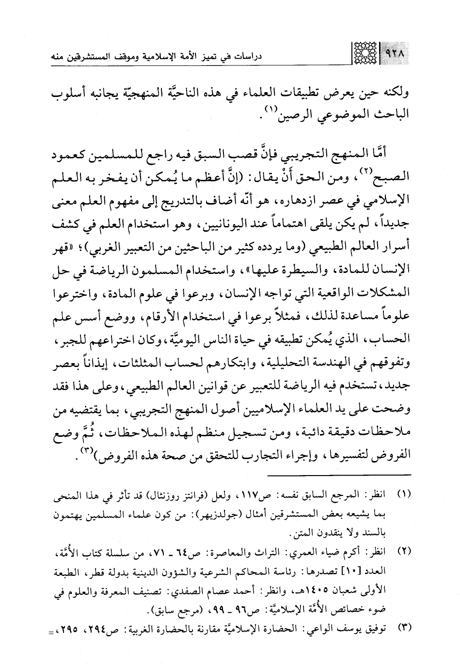 أمَّا المنهج التجريبي فإنَّ قصب السبق فيه راجع للمسلمين كعمود الصبح (¬2)، ومن الحق أَنْ يقال: (إنَّ أعظم ما يُمكن أن يفخر به العلم الإسلامي في عصر ازدهاره، هو أنّه أضاف بالتدريج إلى مفهوم العلم معنى جديدًا، لم يكن يلقى اهتمامًا عند اليونانيين، وهو استخدام العلم في كشف أسرار العالم الطبيعي (وما يردده كثير من الباحثين من التعبير الغربي)؛ "قهر الإنسان للمادة، والسيطرة عليها"، واستخدام المسلمون الرياضة في حل المشكلات الواقعية التي تواجه الإنسان، وبرعوا في علوم المادة، واخترعوا علومًا مساعدة لذلك، فمثلًا برعوا في استخدام الأرقام، ووضع أسس علم الحساب، الذي يُمكن تطبيقه في حياة الناس اليوميَّة، وكان اختراعهم للجبر، وتفوقهم في الهندسة التحليلية، وابتكارهم لحساب المثلثات، إيذانًا بعصر جديد، تستخدم فيه الرياضة للتعبير عن قوانين العالم الطبيعي، وعلى هذا فقد وضحت على يد العلماء الإسلاميين أصول المنهج التجريبي، بما يقتضيه من ملاحظات دقيقة دائبة، ومن تسجيل منظم لهذه الملاحظات، ثُمَّ وضع الفروض لتفسيرها، وإجراء التجارب للتحقق من صحة هذه الفروض) (¬3).