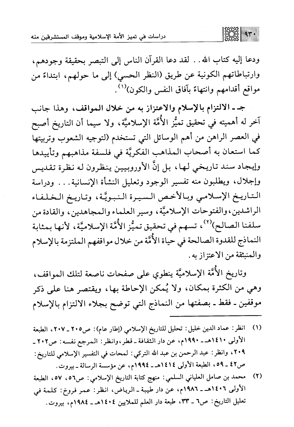 (¬1) انظر: عماد الدين خليل: تحليل للتاريخ الإسلامي (إطار عام): ص 205 - 207، الطبعة الأولى 1410 هـ - 1990 م، عن دار الثقافة - قطر، وانظر: المرجع نفسه: ص 202 - 209، وانظر: عبد الرحمن بن عبد اللَّه التركي: لمحات في التفسير الإسلامي للتاريخ: ص 42 - 59، الطبعة الأولى 1414 هـ - 1994 م، عن مؤسسة الرسالة - بيروت.