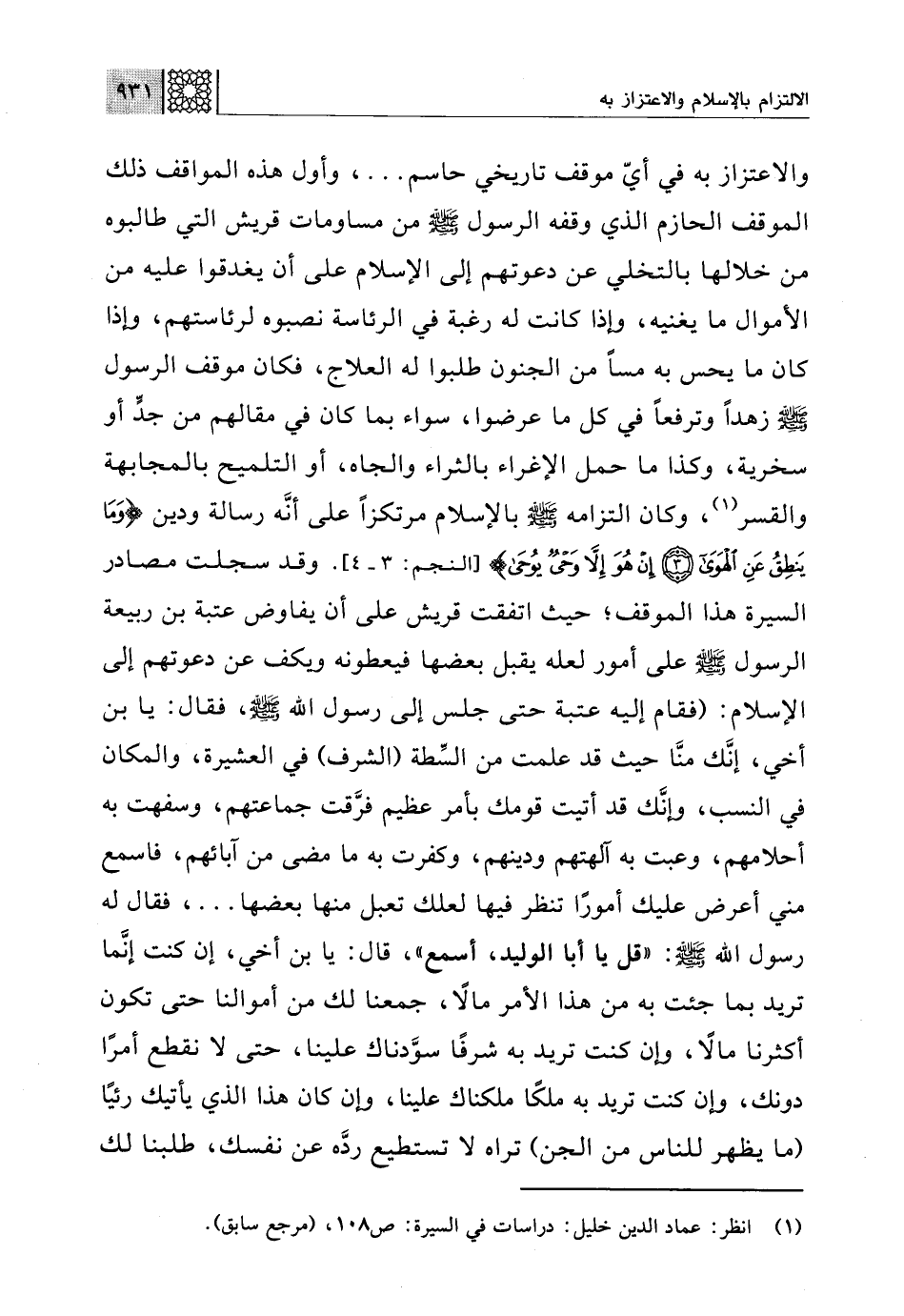 والاعتزاز به في أيّ موقف تاريخي حاسم. . .، وأول هذه المواقف ذلك الموقف الحازم الذي وقفه الرسول -صلى اللَّه عليه وسلم- من مساومات قريش التي طالبوه من خلالها بالتخلي عن دعوتهم إلى الإسلام على أن يغدقوا عليه من الأموال ما يغنيه، وإذا كانت له رغبة في الرئاسة نصبوه لرئاستهم، وإذا كان ما يحس به مسًا من الجنون طلبوا له العلاج، فكان موقف الرسول -صلى اللَّه عليه وسلم- زهدًا وترفعًا في كل ما عرضوا، سواء بما كان في مقالهم من جدٍّ أو سخرية، وكذا ما حمل الإغراء بالثراء والجاه، أو التلميح بالمجابهة والقسر (¬1)، وكان التزامه -صلى اللَّه عليه وسلم- بالإسلام مرتكزًا على أنَّه رسالة ودين {وَمَا يَنْطِقُ عَنِ الْهَوَى (3) إِنْ هُوَ إِلَّا وَحْيٌ يُوحَى} [النجم: 3 - 4]. وقد سجلت مصادر السيرة هذا الموقف؛ حيث اتفقت قريش على أن يفاوض عتبة بن ربيعة الرسول -صلى اللَّه عليه وسلم- على أمور لعله يقبل بعضها فيعطونه ويكف عن دعوتهم إلى الإسلام: (فقام إليه عتبة حتى جلس إلى رسول اللَّه -صلى اللَّه عليه وسلم-، فقال: يا بن أخي، إنَّك منَّا حيث قد علمت من السِّطة (الشرف) في العشيرة، والمكان في النسب، وإنَّك قد أتيت قومك بأمر عظيم فرَّقت جماعتهم، وسفهت به أحلامهم، وعبت به آلهتهم ودينهم، وكفرت به ما مضى من آبائهم، فاسمع مني أعرض عليك أمورًا تنظر فيها لعلك تعبل منها بعضها. . .، فقال له رسول اللَّه -صلى اللَّه عليه وسلم-: "قل يا أبا الوليد، أسمع"، قال: يا بن أخي، إن كنت إنَّما تريد بما جئت به من هذا الأمر مالًا، جمعنا لك من أموالنا حتى تكون أكثرنا مالًا، وإن كنت تريد به شرفًا سوَّدناك علينا، حتى لا نقطع أمرًا دونك، وإن كنت تريد به ملكًا ملكناك علينا، وإن كان هذا الذي يأتيك رئيًا (ما يظهر للناس من الجن) تراه لا تستطيع ردَّه عن نفسك، طلبنا لك