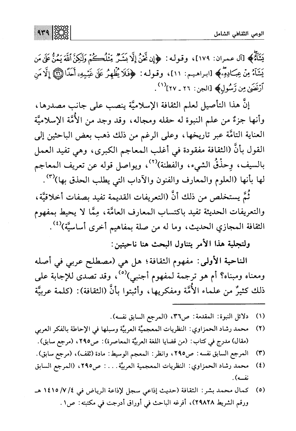 (¬5) كمال محمد بشر: الثقافة (حديث إذاعي سجل لاذاعة الرياض في 7/ 4/ 1415 هـ ورقم الشريط 29828)، أفرغه الباحث في أوراق أدرجت في مكتبته: ص 1.