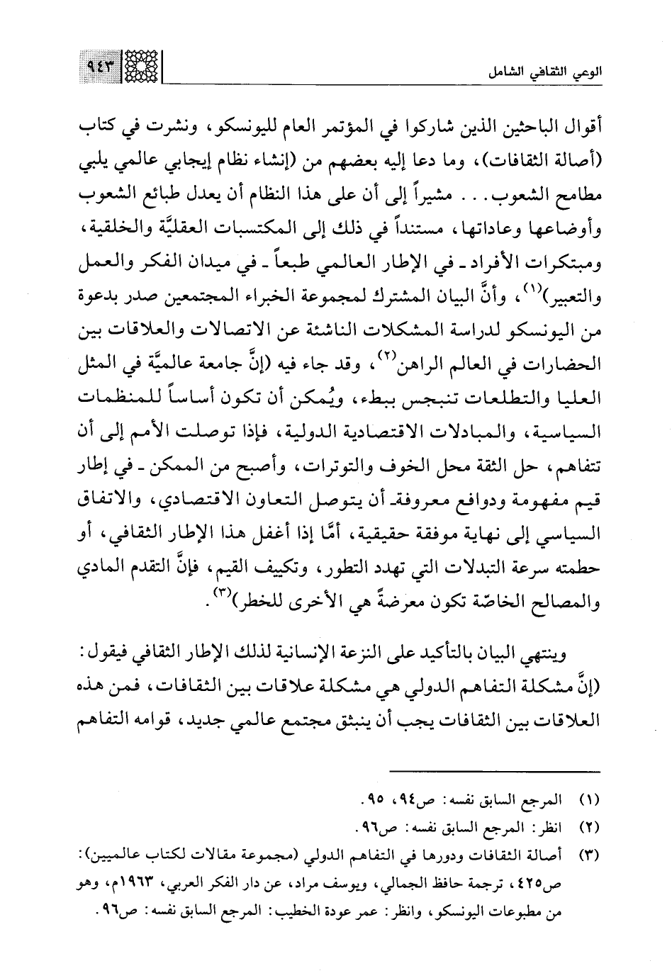 (¬3) أصالة الثقافات ودورها في التفاهم الدولي (مجموعة مقالات لكتاب عالميين): ص 425، ترجمة حافظ الجمالي، ويوسف مراد، عن دار الفكر العربي، 1963 م، وهو من مطبوعات اليونسكو، وانظر: عمر عودة الخطيب: المرجع السابق نفسه: ص 96.