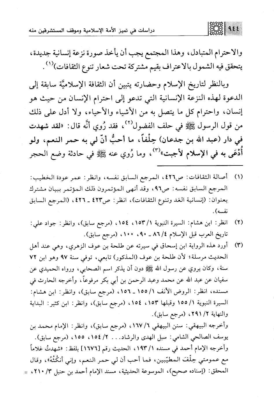 وبالنظر لتاريخ الإسلام وحضارته يتبين أن الثقافة الإسلاميَّة سابقة إلى الدعوة لهذه النزعة الإنسانية التي تدعو إلى احترام الإنسان من حيث هو إنسان، واحترام كل ما يتصل به من الأشياء والأحياء، ولا أدل على ذلك من قول الرسول -صلى اللَّه عليه وسلم- في حلف الفضول (¬2)، فقد رُوي أنَّه قال: "لقد شهدت في دار (عبد اللَّه بن جدعان) حِلْفًا، ما أحبُّ أنّ لي به حمر النعم، ولو أُدْعَى به في الإسلام لأجبت" (¬3)، وما رُوي عنه -صلى اللَّه عليه وسلم- في حادثة وضع الحجر