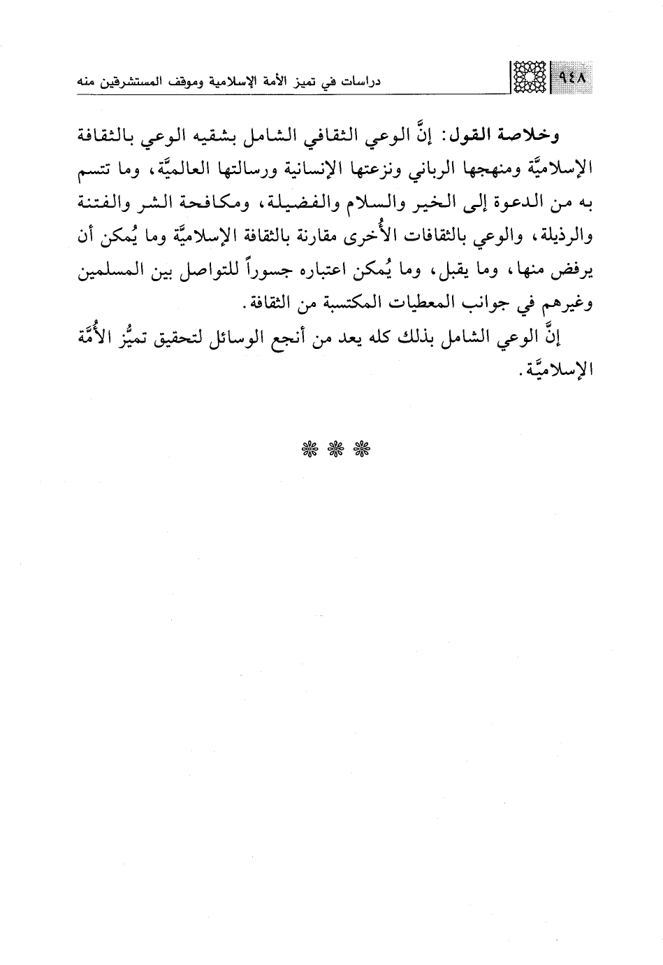 إنَّ الوعي الشامل بذلك كله يعد من أنجع الوسائل لتحقيق تميُّز الأُمَّة الإسلاميَّة.