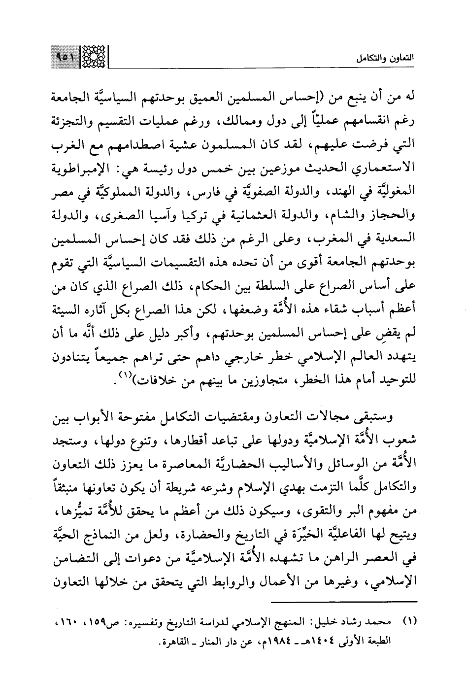 وستبقى مجالات التعاون ومقتضيات التكامل مفتوحة الأبواب بين شعوب الأُمَّة الإسلاميَّة ودولها على تباعد أقطارها، وتنوع دولها، وستجد الأُمَّة من الوسائل والأساليب الحضاريَّة المعاصرة ما يعزز ذلك التعاون والتكامل كلَّما التزمت بهدي الإسلام وشرعه شريطة أن يكون تعاونها منبثقًا من مفهوم البر والتقوى، وسيكون ذلك من أعظم ما يحقق للأُمَّة تميُّزها، ويتيح لها الفاعليَّة الخيِّرَة في التاريخ والحضارة، ولعل من النماذج الحيَّة في العصر الراهن ما تشهده الأُمَّة الإسلاميَّة من دعوات إلى التضامن الإسلامي، وغيرها من الأعمال والروابط التي يتحقق من خلالها التعاون