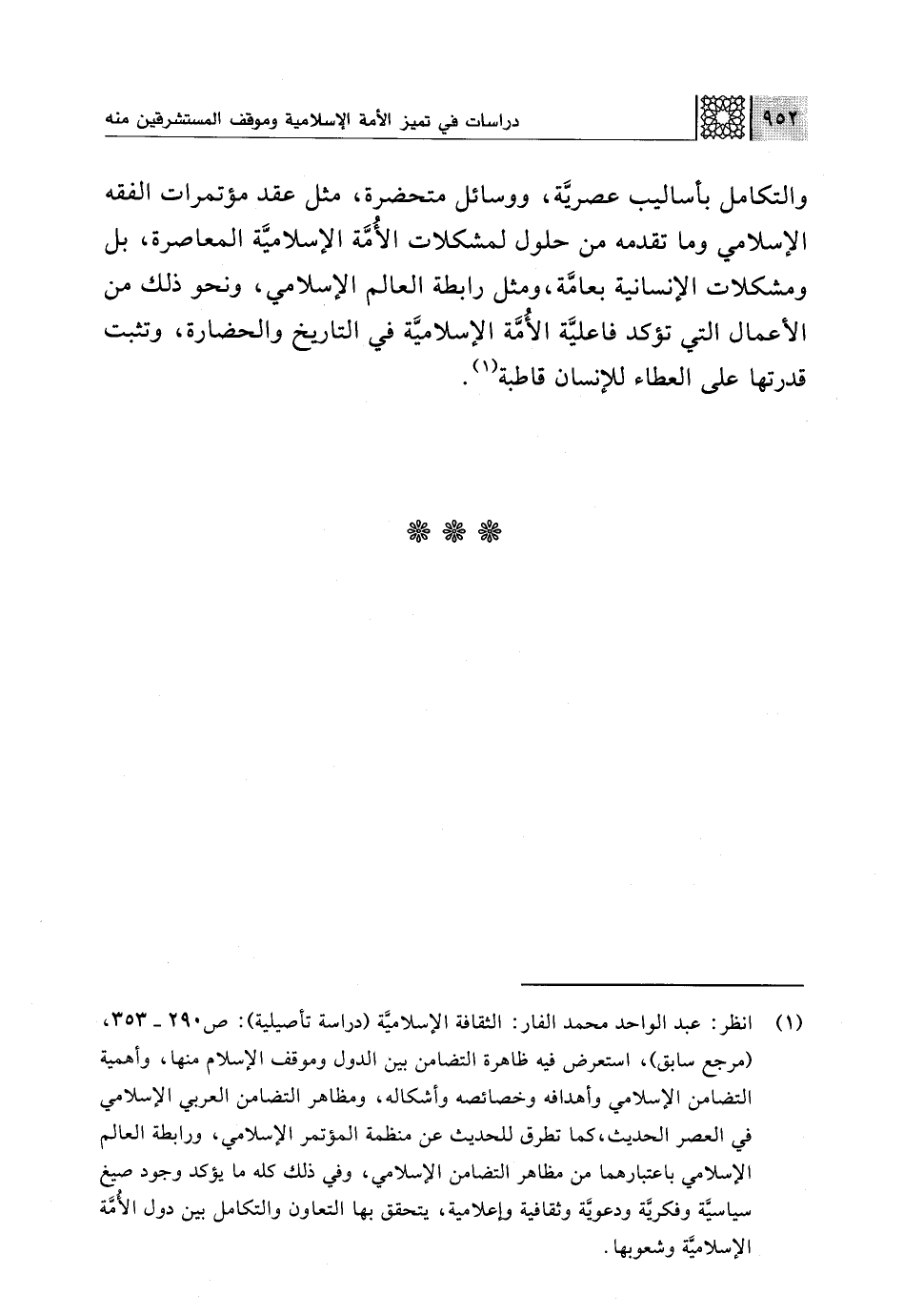 (¬1) انظر: عبد الواحد محمد الفار: الثقافة الإسلاميَّة (دراسة تأصيلية): ص 290 - 353، (مرجع سابق)، استعرض فيه ظاهرة التضامن بين الدول وموقف الإسلام منها، وأهمية التضامن الإسلامي وأهدافه وخصائصه وأشكاله، ومظاهر التضامن العربي الإسلامي في العصر الحديث، كما تطرق للحديث عن منظمة المؤتمر الإسلامي، ورابطة العالم الإسلامي باعتبارهما من مظاهر التضامن الإسلامي، وفي ذلك كله ما يؤكد وجود صيغ سياسيَّة وفكريَّة ودعويَّة وثقافية وإعلامية، يتحقق بها التعاون والتكامل بين دول الأُمَّة الإسلاميَّة وشعوبها.