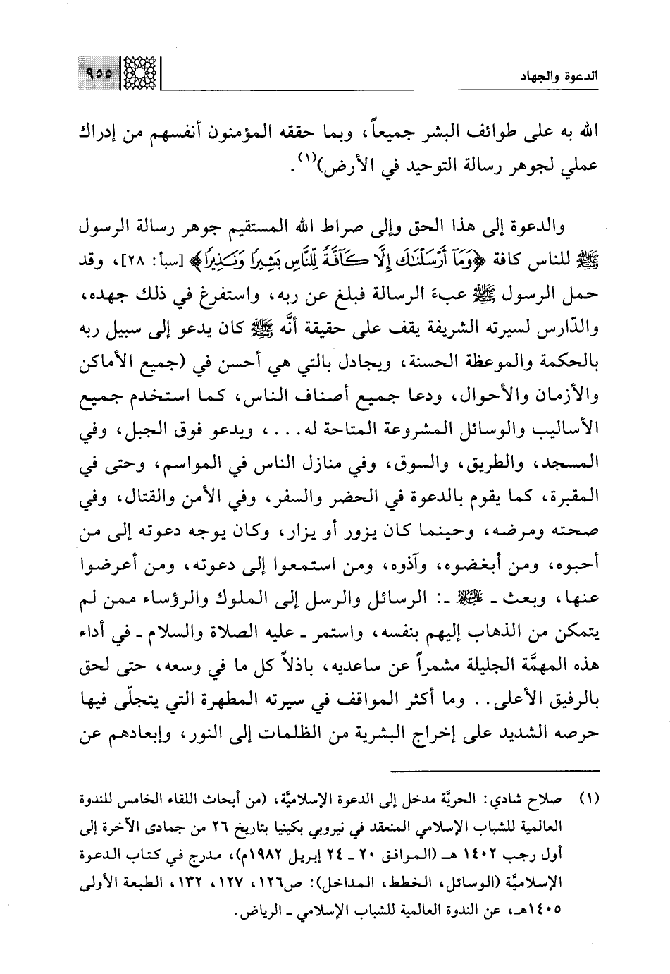 والدعوة إلى هذا الحق وإلى صراط اللَّه المستقيم جوهر رسالة الرسول -صلى اللَّه عليه وسلم- للناس كافة {وَمَا أَرْسَلْنَاكَ إِلَّا كَافَّةً لِلنَّاسِ بَشِيرًا وَنَذِيرًا} [سبأ: 28]، وقد حمل الرسول -صلى اللَّه عليه وسلم- عبءَ الرسالة فبلغ عن ربه، واستفرغ في ذلك جهده، والدّارس لسيرته الشريفة يقف على حقيقة أنَّه -صلى اللَّه عليه وسلم- كان يدعو إلى سبيل ربه بالحكمة والموعظة الحسنة، ويجادل بالتي هي أحسن في (جميع الأماكن والأزمان والأحوال، ودعا جميع أصناف الناس، كما استخدم جميع الأساليب والوسائل المشروعة المتاحة له. . .، ويدعو فوق الجبل، وفي المسجد، والطريق، والسوق، وفي منازل الناس في المواسم، وحتى في المقبرة، كما يقوم بالدعوة في الحضر والسفر، وفي الأمن والقتال، وفي صحته ومرضه، وحينما كان يزور أو يزار، وكان يوجه دعوته إلى من أحبوه، ومن أبغضوه، وآذوه، ومن استمعوا إلى دعوته، ومن أعرضوا عنها، وبعث -عليه السلام-: الرسائل والرسل إلى الملوك والرؤساء ممن لم يتمكن من الذهاب إليهم بنفسه، واستمر -عليه الصلاة والسلام- في أداء هذه المهمَّة الجليلة مشمرًا عن ساعديه، باذلًا كل ما في وسعه، حتى لحق بالرفيق الأعلى. . وما أكثر المواقف في سيرته المطهرة التي يتجلّى فيها حرصه الشديد على إخراج البشرية من الظلمات إلى النور، وإبعادهم عن