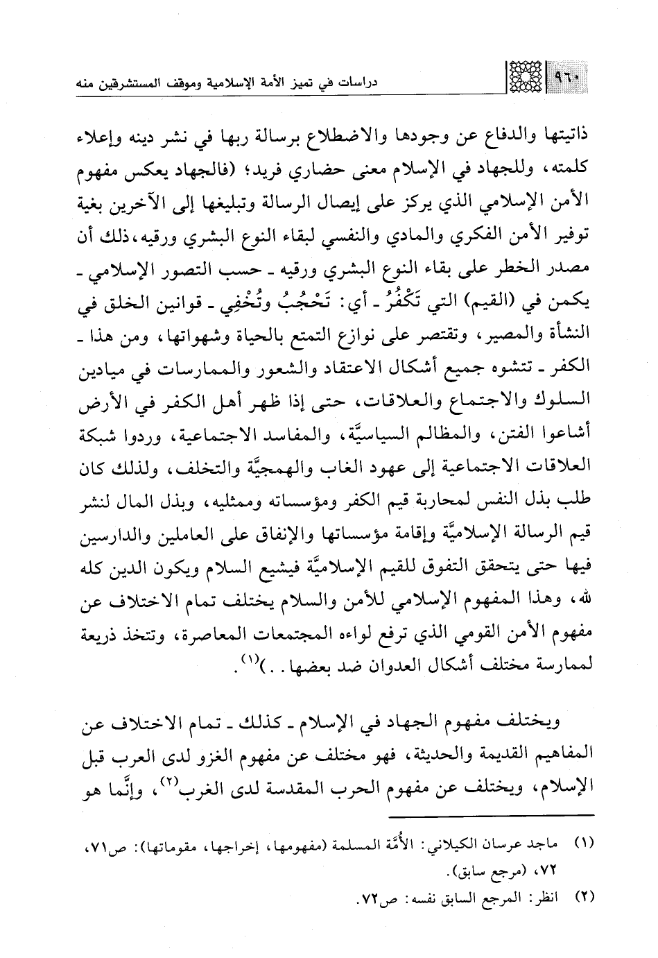 ذاتيتها والدفاع عن وجودها والاضطلاع برسالة ربها في نشر دينه وإعلاء كلمته، وللجهاد في الإسلام معنى حضاري فريد؛ (فالجهاد يعكس مفهوم الأمن الإِسلامي الذي يركز على إيصال الرسالة وتبليغها إلى الآخرين بغية توفير الأمن الفكري والمادي والنفسي لبقاء النوع البشري ورقيه، ذلك أن مصدر الخطر على بقاء النوع البشري ورقيه -حسب التصور الإِسلامي- يكمن في (القيم) التي تَكْفُرُ -أي: تَحْجُبُ وتُخْفِي- قوانين الخلق في النشأة والمصير، وتقتصر على نوازع التمتع بالحياة وشهواتها، ومن هذا -الكفر- تتشوه جميع أشكال الاعتقاد والشعور والممارسات في ميادين السلوك والاجتماع والعلاقات، حتى إذا ظهر أهل الكفر في الأرض أشاعوا الفتن، والمظالم السياسيَّة، والمفاسد الاجتماعية، وردوا شبكة العلاقات الاجتماعية إلى عهود الغاب والهمجيَّة والتخلف، ولذلك كان طلب بذل النفس لمحاربة قيم الكفر ومؤسساته وممثليه، وبذل المال لنشر قيم الرسالة الإسلاميَّة وإقامة مؤسساتها والإنفاق على العاملين والدارسين فيها حتى يتحقق التفوق للقيم الإسلاميَّة فيشيع السلام ويكون الدين كله للَّه، وهذا المفهوم الإِسلامي للأمن والسلام يختلف تمام الاختلاف عن مفهوم الأمن القومي الذي ترفع لواءه المجتمعات المعاصرة، وتتخذ ذريعة لممارسة مختلف أشكال العدوان ضد بعضها. .) (¬1).