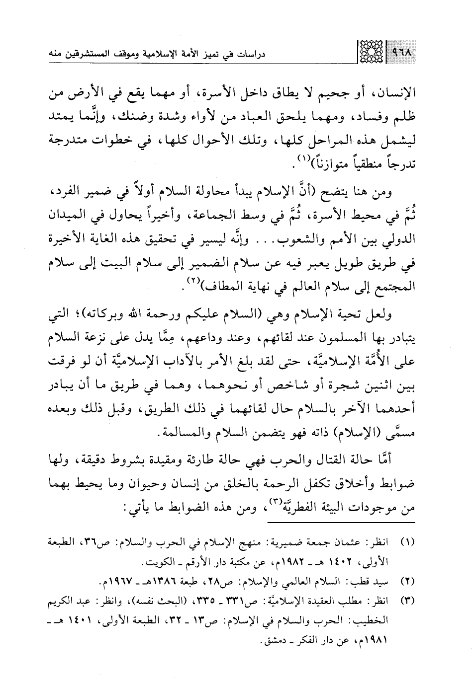 (¬3) انظر: مطلب العقيدة الإسلاميَّة: ص 331 - 335، (البحث نفسه)، وانظر: عبد الكريم الخطيب: الحرب والسلام في الإسلام: ص 13 - 32، الطبعة الأولى، 1401 هـ - 1981 م، عن دار الفكر - دمشق.