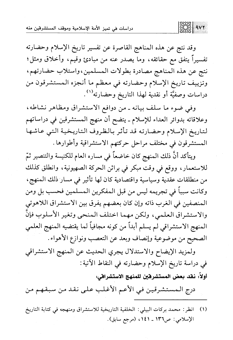 (¬1) انظر: محمد بركات البيلي: الخلفية التاريخية للاستشراق ومنهجه في كتابة التاريخ الإسلامي: ص 136 - 141، (مرجع سابق).