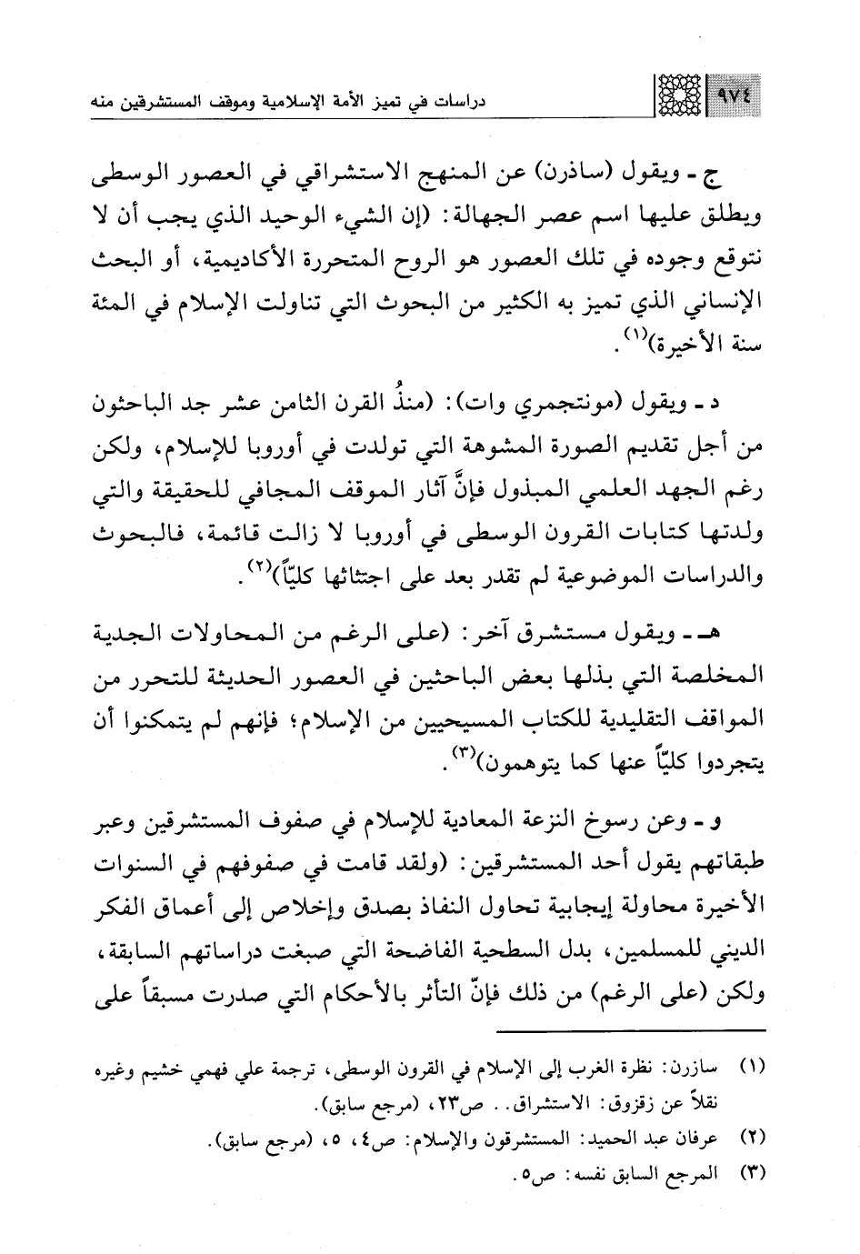 (¬1) سازرن: نظرة الغرب إلى الإسلام في القرون الوسطى، ترجمة علي فهمي خشيم وغيره نقلًا عن زقزوق: الاستشراق. . ص 23، (مرجع سابق).