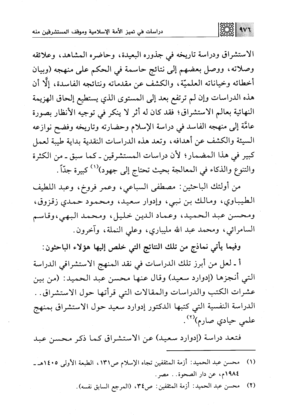 أ- لعل من أبرز تلك الدراسات في نقد المنهج الاستشراقي الدراسة التي أنجزها (إدوارد سعيد) وقال عنها محسن عبد الحميد: (من بين عشرات الكتب والدراسات والمقالات التي قرأتها حول الاستشراق. . الدراسة النفسية التي كتبها الدكتور إدوارد سعيد حول الاستشراق بمنهج علمي حيادي صارم) (¬2).