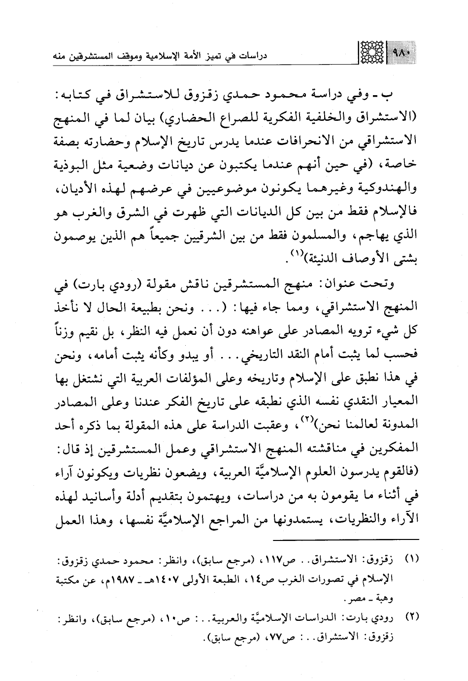 ب- وفي دراسة محمود حمدي زقزوق للاستشراق في كتابه: (الاستشراق والخلفية الفكرية للصراع الحضاري) بيان لما في المنهج الاستشراقي من الانحرافات عندما يدرس تاريخ الإسلام وحضارته بصفة خاصة، (في حين أنهم عندما يكتبون عن ديانات وضعية مثل البوذية والهندوكية وغيرهما يكونون موضوعيين في عرضهم لهذه الأديان، فالإِسلام فقط من بين كل الديانات التي ظهرت في الشرق والغرب هو الذي يهاجم، والمسلمون فقط من بين الشرقيين جميعًا هم الذين يوصمون بشتى الأوصاف الدنيئة) (¬1).