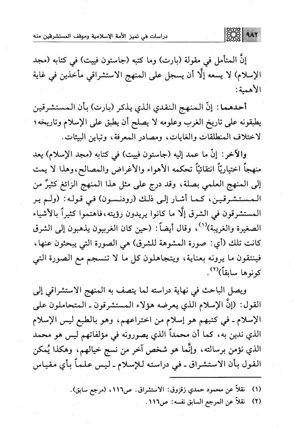 أحدهما: إنّ المنهج النقدي الذي يذكر (بارت) بأن المستشرقين يطبقونه على تاريخ الغرب وعلومه لا يصلح أن يطبق على الإسلام وتاريخه؛ لاختلاف المنطلقات والغايات، ومصادر المعرفة، وتباين البيئات.