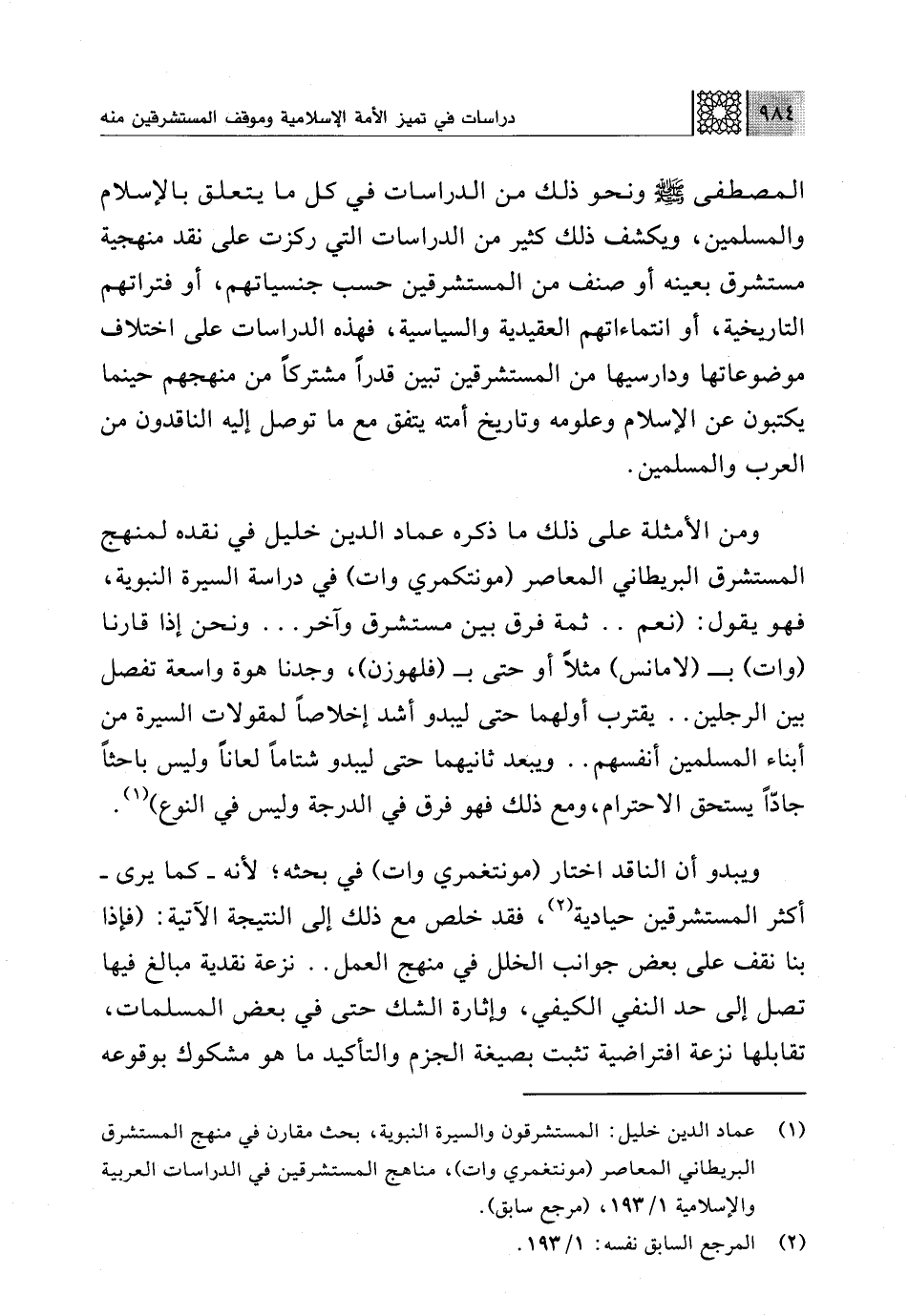 (¬1) عماد الدين خليل: المستشرقون والسيرة النبوية، بحث مقارن في منهج المستشرق البريطاني المعاصر (مونتغمري وات)، مناهج المستشرقين في الدراسات العربيَّة والإِسلامية 1/ 193، (مرجع سابق).