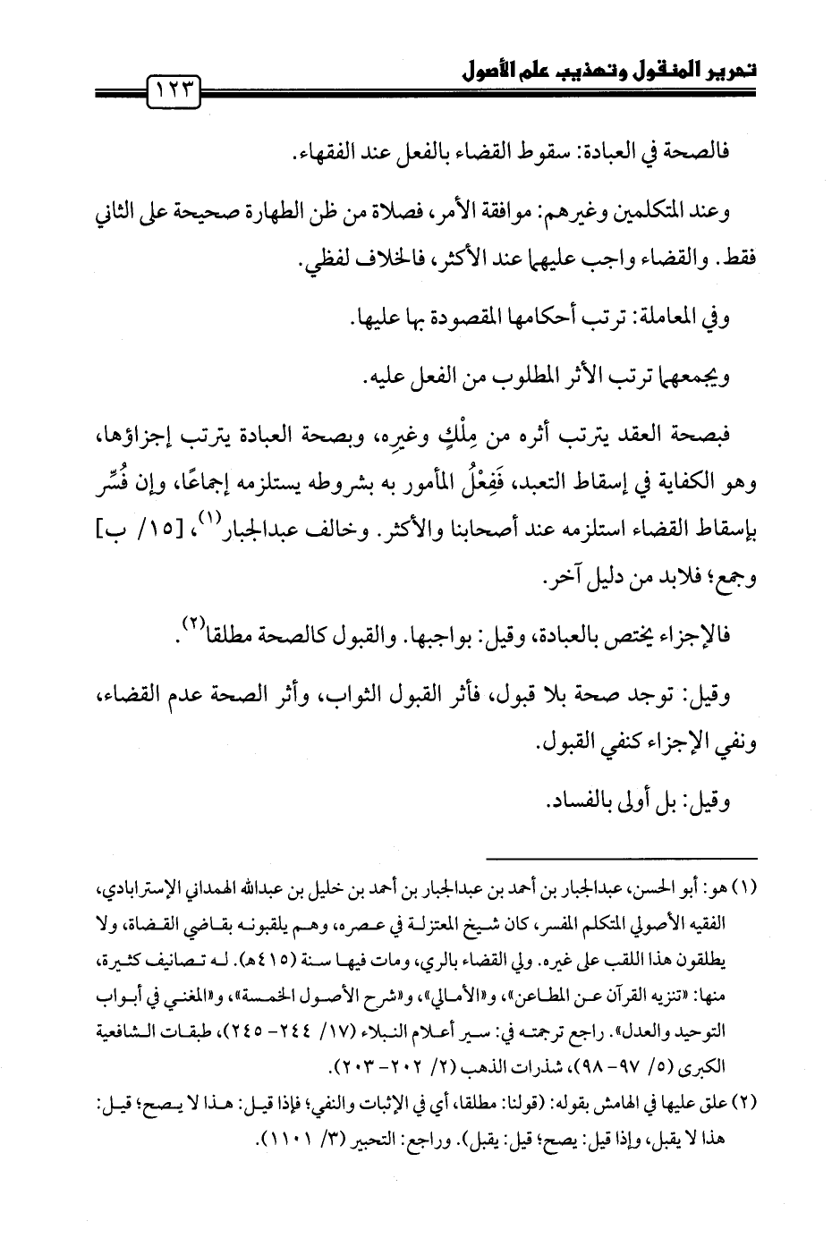 وعند المتكلمين وغيرهم: موافقة الأمر، فصلاة من ظن الطهارة صحيحة على الثاني فقط. والقضاء واجب عليهما عند الأكثر، فالخلاف لفظي.