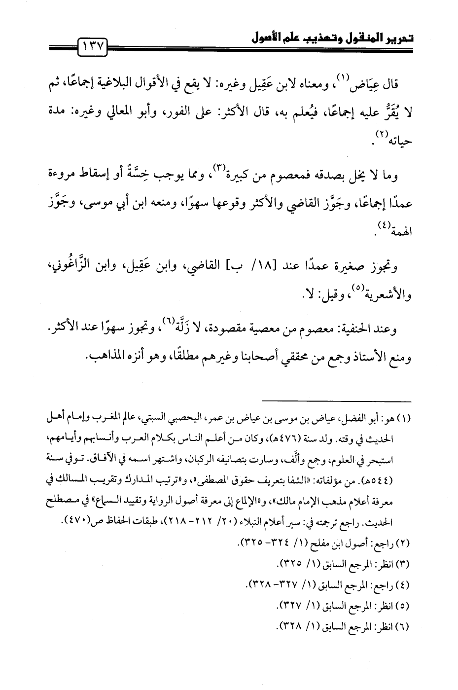 وعند الحنفية: معصوم من معصية مقصودة، لا زَلَّة (٦)، وتجوز سهوًا عند الأكثر. ومنع الأستاذ وجمع من محققي أصحابنا وغيرهم مطلقًا، وهو أنزه المذاهب.