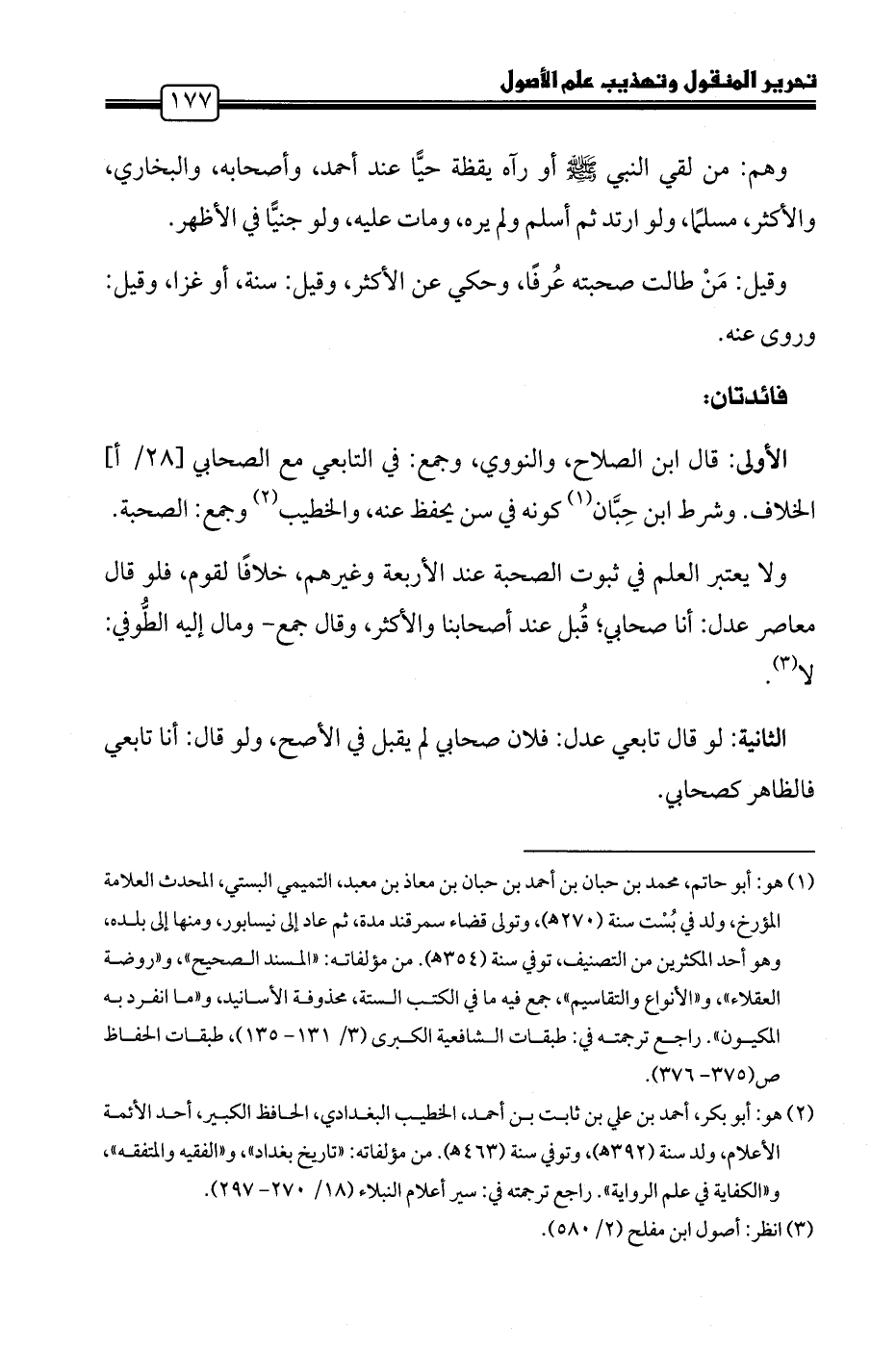 الأولى: قال ابن الصلاح، والنووي، وجمع: في التابعي مع الصحابي الخلاف. وشرط ابن حِبَّان (١) كونه في سن يحفظ عنه، والخطيب (٢) وجمع: الصحبة.