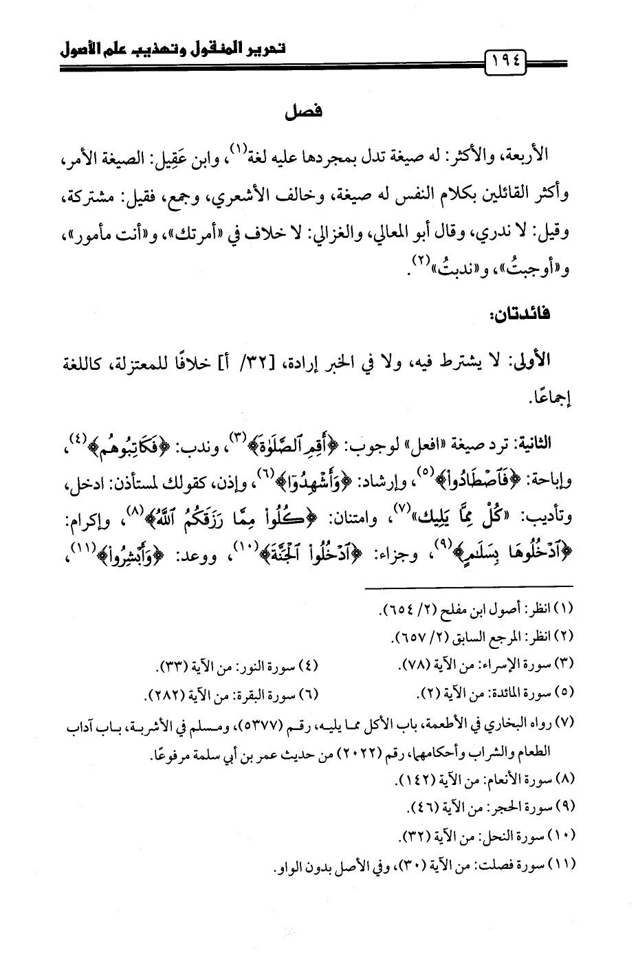 الثانية: ترد صيغة "افعل" لوجوب: {أَقِمِ الْصَّلَاةَ} (٣)، وندب: {فَكَاتِبُوهُمْ} (٤)، وإباحة: {فَاصْطَادُوا} (٥)، وإرشاد: {وَأَشْهِدُوا} (٦)، وإذن، كقولك لمستأذن: ادخل، وتأديب: "كُلْ مِمَّا يَلِيك" (٧)، وامتنان: {كُلُوا مِمَّا رَزَقَكُمُ اللَّهُ} (٨)، وإكرام: {اْدْخُلُوهَا بِسَلَامٍ} (٩)، وجزاء: {ادْخُلُوا الْجَنَّةَ} (١٠)، ووعد: {وَأَبْشِرُوا} (١١)،