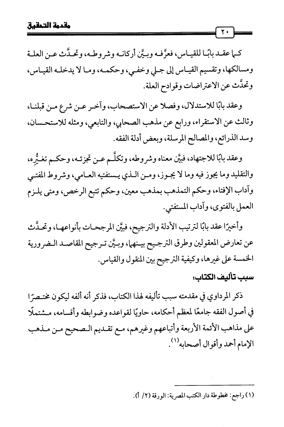ذكر المرداوي في مقدمته سبب تأليفه لهذا الكتاب، فذكر أنه ألفه ليكون مختصرًا في أصول الفقه جامعًا لمعظم أحكامه، حاويًا لقواعده وضوابطه وأقسامه، مشتملًا على مذاهب الأئمة الأربعة وأتباعهم وغيرهم، مع تقديم الصحيح من مذهب الإمام أحمد وأقوال أصحابه (١).