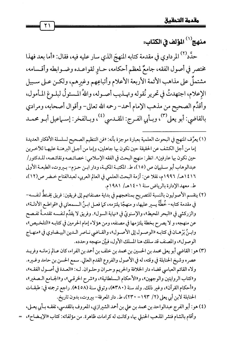 (٣) هو: القاضي أبو يعلى محمد بن الحسين بن محمد بن خلف بن أحمد بن الفراء، كان عالم زمانه وفريد عصره وشيخ الحنابلة في وقته، له في الأصول والفروع القدم العالي. سمع الحسن بن حامد وغيره. ولاه القائم العباسي قضاء دار الخلافة والحريم وحران وحلوان. له: "العدة في أصول الفقه"، و"كتاب الروايتين والوجهين"، و"الأحكام السلطانية"، و"شرح الخرقي"، و"الجامع الصغير"، و"أحكام القرآن"، وغير ذلك. ولد سنة (٣٨٠ هـ)، وتوفي سنة (٤٥٨ هـ). راجع ترجمته في: طبقات الحنابلة لابن أبي يعلى (٢/ ١٩٣ - ٢٣٠)، ط. دار المعرفة - بيروت، بدون تاريخ.