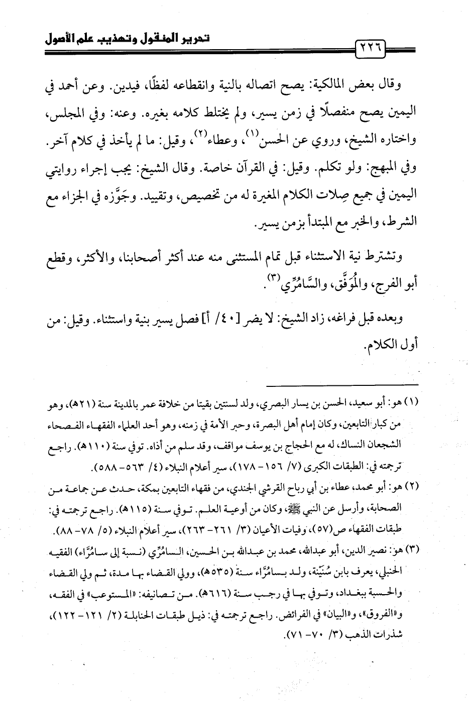وقال بعض المالكية: يصح اتصاله بالنية وانقطاعه لفظًا، فيدين. وعن أحمد في اليمين يصح منفصلًا في زمن يسير، ولم يختلط كلامه بغيره. وعنه: وفي المجلس، واختاره الشيخ، وروي عن الحسن (١)، وعطاء (٢)، وقيل: ما لم يأخذ في كلام آخر. وفي المبهج: ولو تكلم. وقيل: في القرآن خاصة. وقال الشيخ: يجب إجراء روايتي اليمين في جميع صِلات الكلام المغيرة له من تخصيص، وتقييد. وجَوَّزه في الجزاء مع الشرط، والخبر مع المبتدأ بزمن يسير.