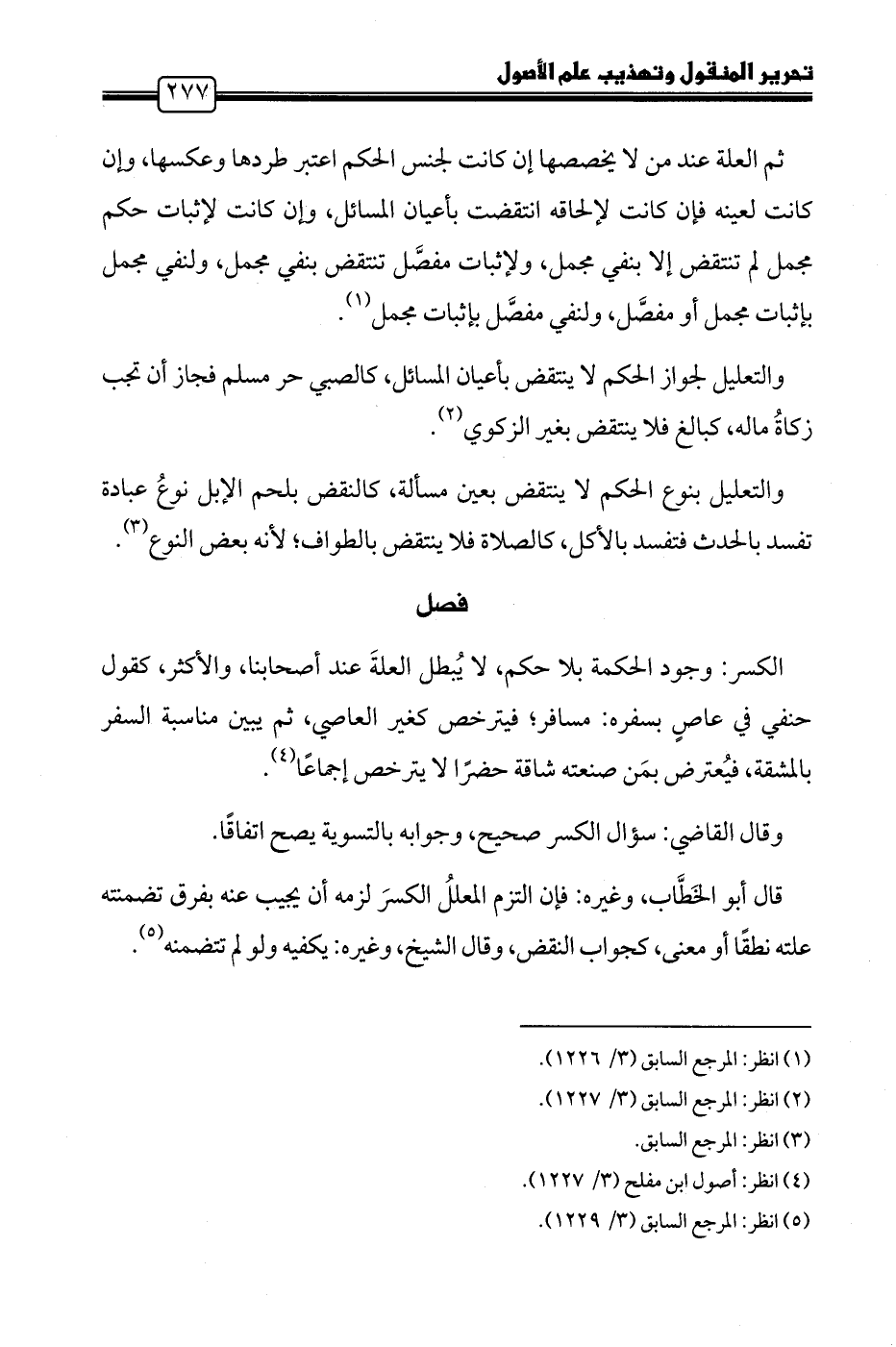 الكسر: وجود الحكمة بلا حكم، لا يُبطل العلةَ عند أصحابنا، والأكثر، كقول حنفي في عاصٍ بسفره: مسافر؛ فيترخص كغير العاصي، ثم يبين مناسبة السفر بالمشقة، فيُعترض بمَن صنعته شاقة حضرًا لا يترخص إجماعًا (٤).