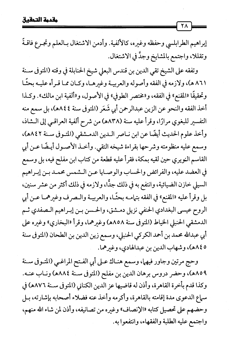 وتفقه على الشيخ تقي الدين بن قندس البعلي شيخ الحنابلة في وقته (المتوفى سنة ٨٦١ هـ)، ولازمه في الفقه وأصوله والعربية وغيرها، وكان مما قرأه عليه بحثًا وتحقيقًا "المقنع" في الفقه، و"مختصر الطوفي" في الأصول، و"ألفية ابن مالك". وكذا أخذ الفقه والنحو عن الزين عبد الرحمن أبي شَعَر (المتوفى سنة ٨٤٤ هـ)، بل سمع منه التفسير للبغوي مرارًا، وقرأ عليه سنة (٨٣٨ هـ) من شرح ألفية العراقي إلى الشاذ، وأخذ علوم الحديث أيضًا عن ابن ناصر الدين الدمشقي (المتوفى سنة ٨٤٢ هـ)، وسمع عليه منظومته وشرحها بقراءة شيخه التقي. وأخذ الأصول أيضًا عن أبي القاسم الفويري حين لقيه بمكة، فقرأ عليه قطعة من كتاب ابن مفلح فيه، بل وسمع في العضد عليه، والفرائض والحساب والوصايا عن الشمس محمد بن إبراهيم السيلي خازن الضيائية، وانتفع به في ذلك جدًّا، ولازمه في ذلك أكثر من عشر سنين، بل وقرأ عليه "المقنع" في الفقه بتمامه بحثًا، والعربية والصرف وغيرهما عن أبي الروح عيسى البغدادي الحنفي نزيل دمشق، والحسن بن إبراهيم الصفدي ثم الدمشقي الحنبلي الخياط (المتوفى سنة ٨٥٨ هـ) وغيرهما، وقرأ "البخاري" وغيره على أبي عبد اللَّه محمد بن أحمد الكركي الحنبلي، وسمع زين الدين بن الطحان (المتوفى سنة ٨٤٥ هـ)، وشهاب الدين بن عبد الهادي، وغيرهما.