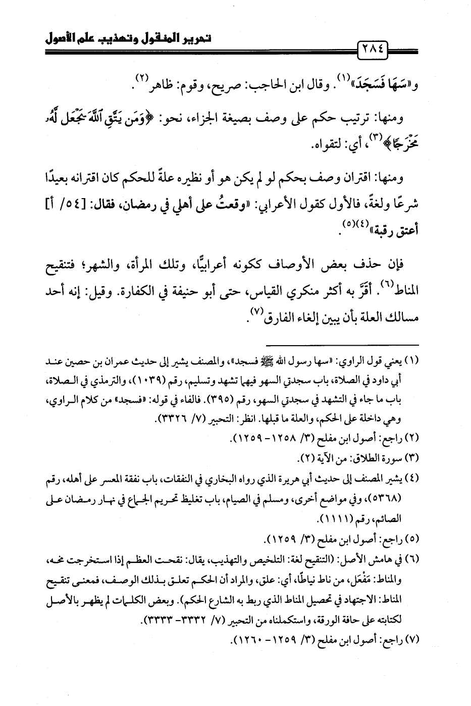 (٦) في هامش الأصل: (التنقيح لغة: التلخيص والتهذيب، يقال: نقحت العظم إذا استخرجت مخه، والمناط: مَفْعَل، من ناط نياطًا، أي: علق، والمراد أن الحكم تعلق بذلك الوصف، فمعنى تنقيح المناط: الاجتهاد في تحصيل المناط الذي ربط به الشارع الحكم). وبعض الكلمات لم يظهر بالأصل لكتابته على حافة الورقة، واستكملناه من التحبير (٧/ ٣٣٣٢ - ٣٣٣٣).