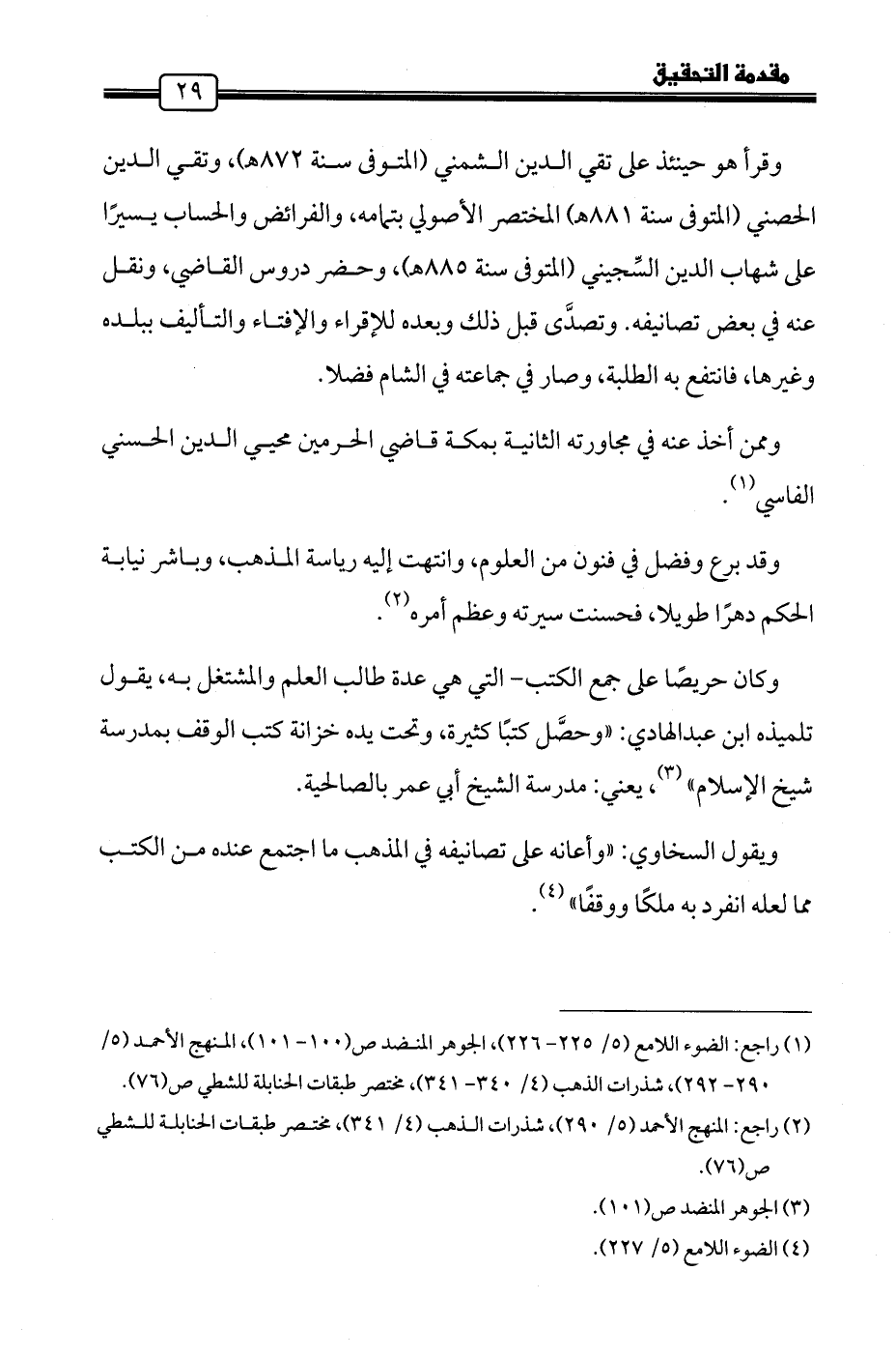 (١) راجع: الضوء اللامع (٥/ ٢٢٥ - ٢٢٦)، الجوهر المنضد ص (١٠٠ - ١٠١)، المنهج الأحمد (٥/ ٢٩٠ - ٢٩٢)، شذرات الذهب (٤/ ٣٤٠ - ٣٤١)، مختصر طبقات الحنابلة للشطي ص (٧٦).