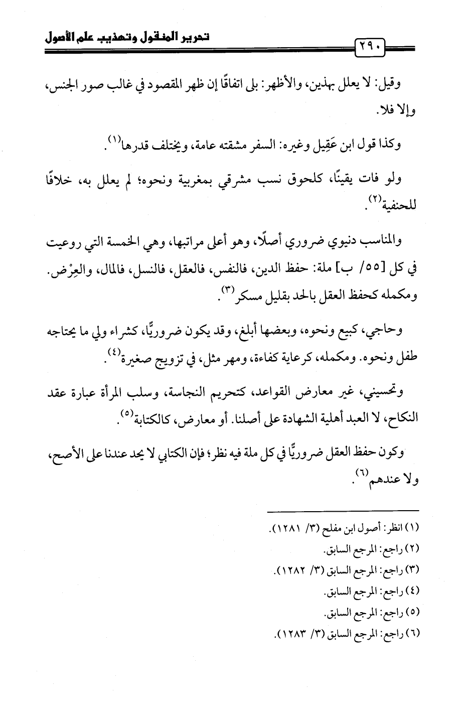 والمناسب دنيوي ضروري أصلًا، وهو أعلى مراتبها، وهي الخمسة التي روعيت في كل ملة: حفظ الدين، فالنفس، فالعقل، فالنسل، فالمال، والعِرْض. ومكمله كحفظ العقل بالحد بقليل مسكر (٣).