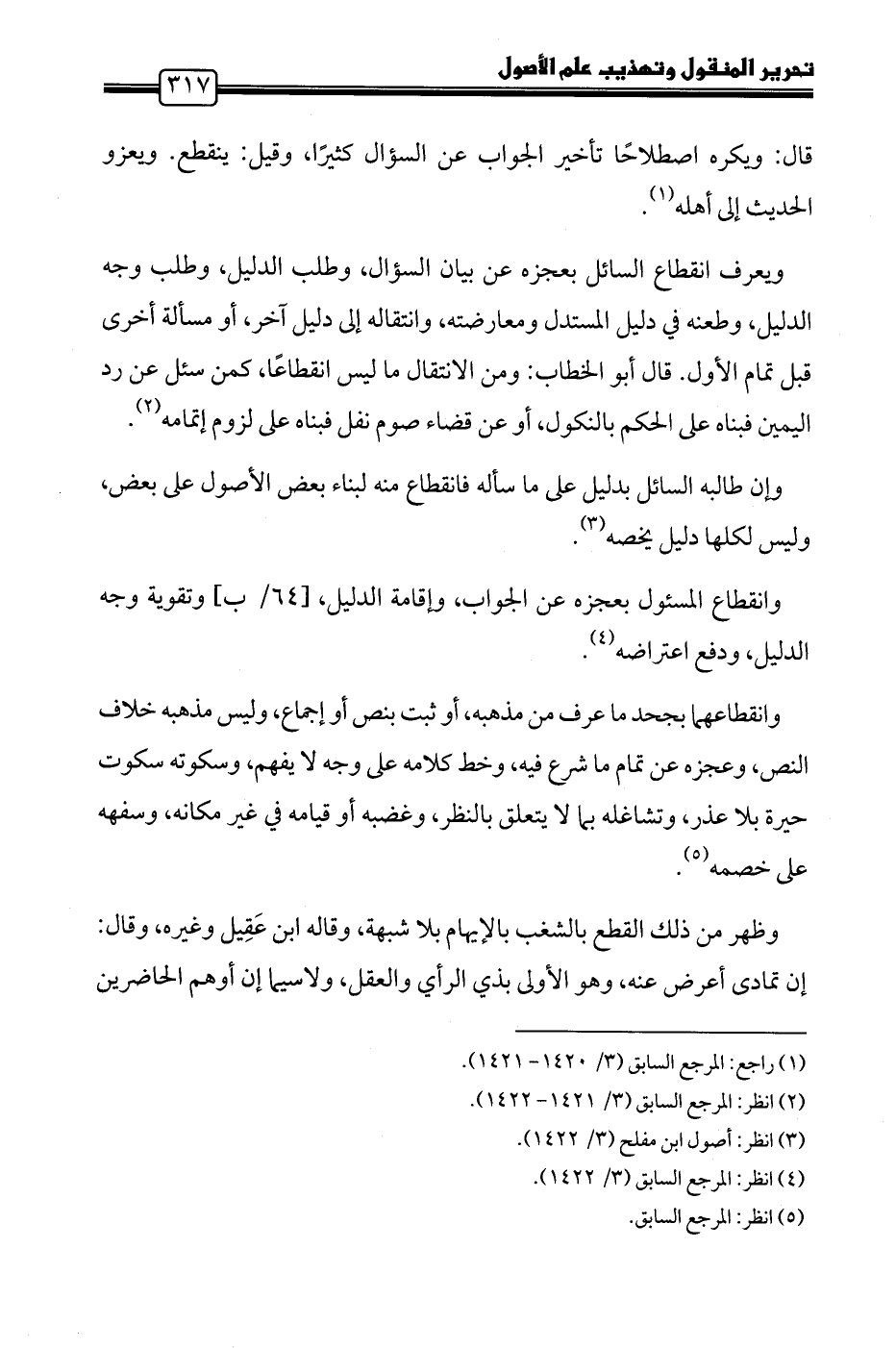 قال: ويكره اصطلاحًا تأخير الجواب عن السؤال كثيرًا، وقيل: ينقطع. ويعزو الحديث إلى أهله (١).
