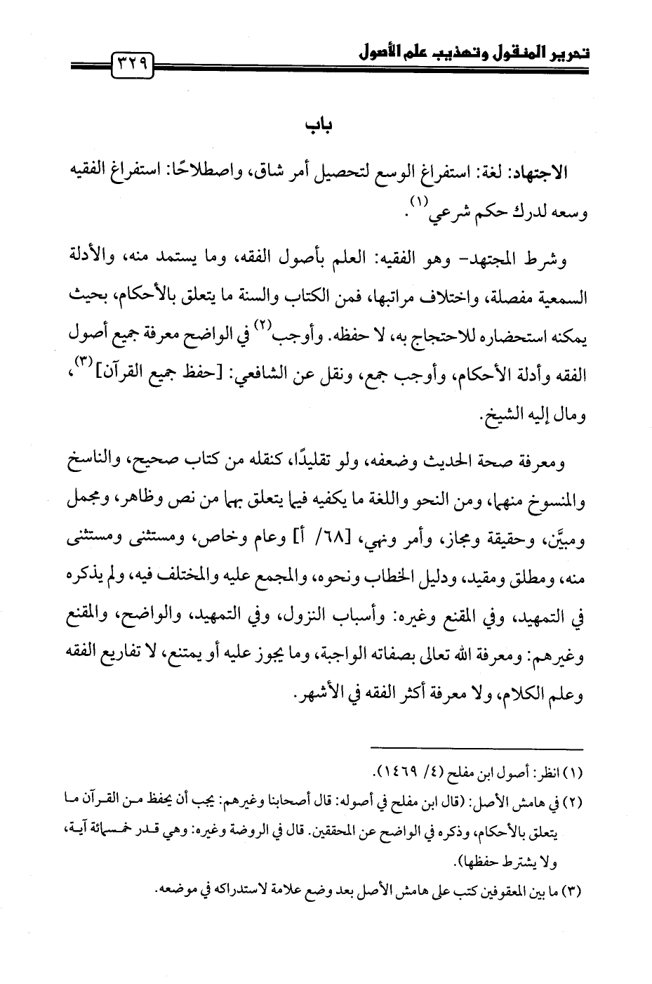 (٢) في هامش الأصل: (قال ابن مفلح في أصوله: فال أصحابنا وغيرهم: يجب أن يحفظ من القرآن ما يتعلق بالأحكام، وذكره في الواضح عن المحققين. قال في الروضة وغيره: وهي قدر خمسمائة آية، ولا يشترط حفظها).