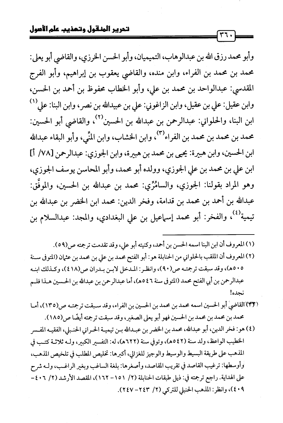 وأبو محمد رزق اللَّه بن عبد الوهاب، التميميان، وأبو الحسن الخرزي، والقاضي أبو يعلى: محمد بن محمد بن الفراء، وابن منده، والقاضي يعقوب بن إبراهيم، وأبو الفرج المقدسي: عبد الواحد بن محمد بن علي، وأبو الخطاب محفوظ بن أحمد بن الحسن، وابن عقيل: علي بن عقيل، وابن الزاغوني: علي بن عبيد اللَّه بن نصر، وابن البنا: علي (١) ابن البنا، والحلواني: عبد الرحمن بن عبد اللَّه بن الحسين (٢)، والقاضي أبو الحسين: محمد بن محمد بن محمد بن الفراء (٣)، وابن الخشاب، وابن المنِّي، وأبو البقاء عبد اللَّه ابن الحسين، وابن هبيرة: يحيى بن محمد بن هبيرة، وابن الجوزي: عبد الرحمن ابن علي بن محمد بن علي الجوزي، وولده أبو محمد، وأبو المحاسن يوسف الجوزي، وهو المراد بقولنا: الجوزي، والسامُرِّي: محمد بن عبد اللَّه بن الحسين، والموفَّق: عبد اللَّه بن أحمد بن محمد بن قدامة، وفخر الدين: محمد ابن الخضر بن عبد اللَّه بن تيميه (٤)، والفخر: أبو محمد إسماعيل بن علي البغدادي، والمجد: عبد السلام بن