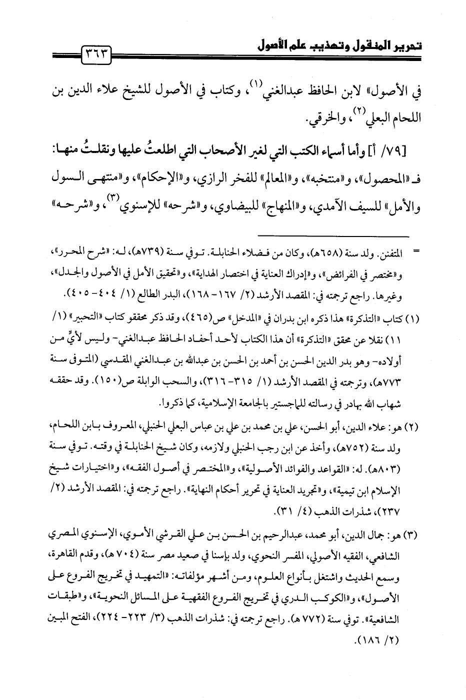 (٢) هو: علاء الدين، أبو الحسن، علي بن محمد بن علي بن عباس البعلي الحنبلي، المعروف بابن اللحام، ولد سنة (٧٥٢ هـ)، وأخذ عن ابن رجب الحنبلي ولازمه، وكان شيخ الحنابلة في وقته. توفي سنة (٨٠٣ هـ). له: "القواعد والفوائد الأصولية"، و"المختصر في أصول الفقه"، و"اختيارات شيخ الإسلام ابن تيمية"، و"تجريد العناية في تحرير أحكام النهاية". راجع ترجمته في: المقصد الأرشد (٢/ ٢٣٧)، شذرات الذهب (٤/ ٣١).