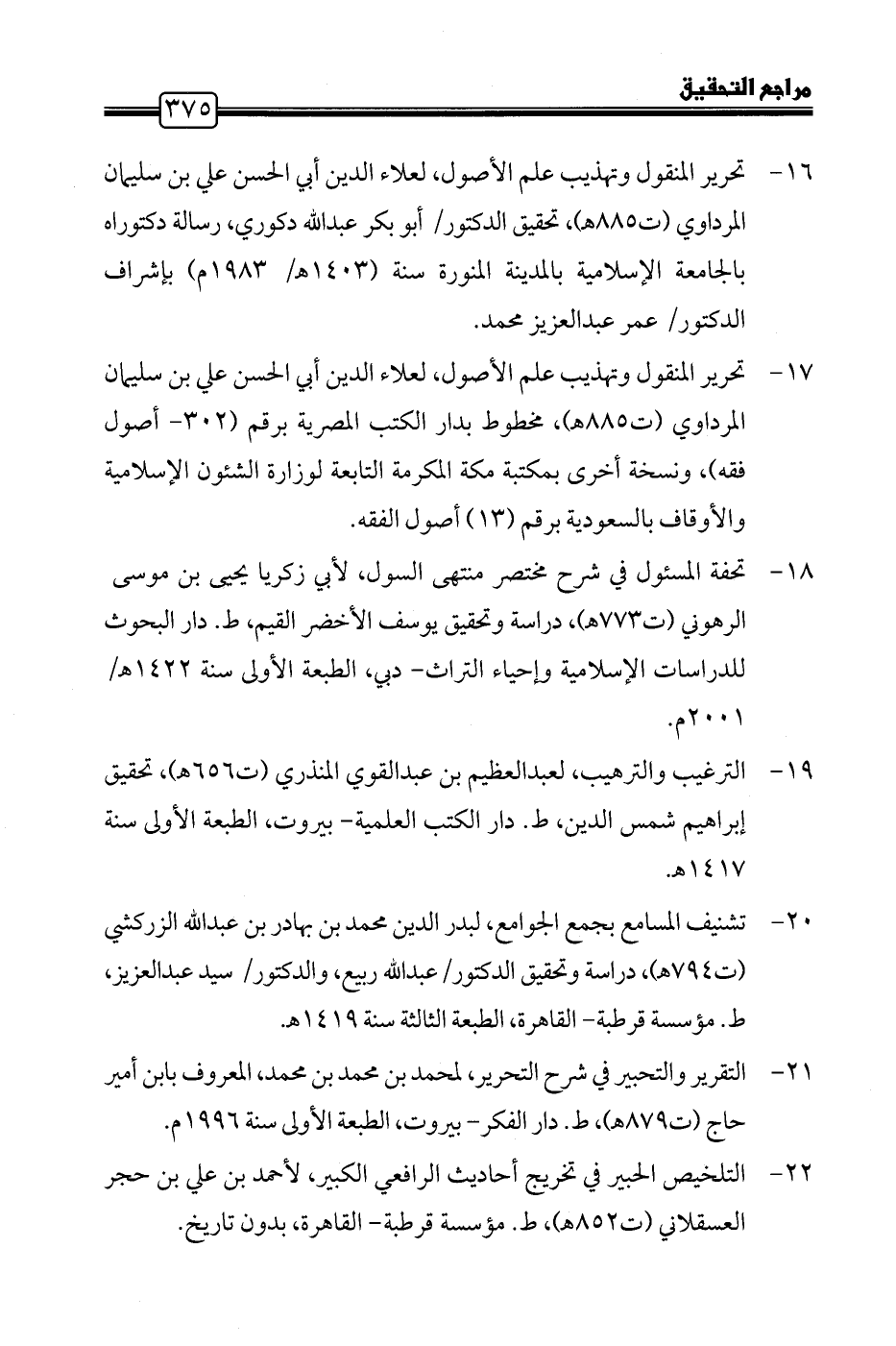 ١٦ - تحرير المنقول وتهذيب علم الأصول، لعلاء الدين أبي الحسن علي بن سليمان المرداوي (ت ٨٨٥ هـ)، تحقيق الدكتور/ أبو بكر عبد اللَّه دكوري، رسالة دكتوراه بالجامعة الإسلامية بالمدينة المنورة سنة (١٤٠٣ هـ/ ١٩٨٣ م) بإشراف الدكتور/ عمر عبد العزيز محمد.