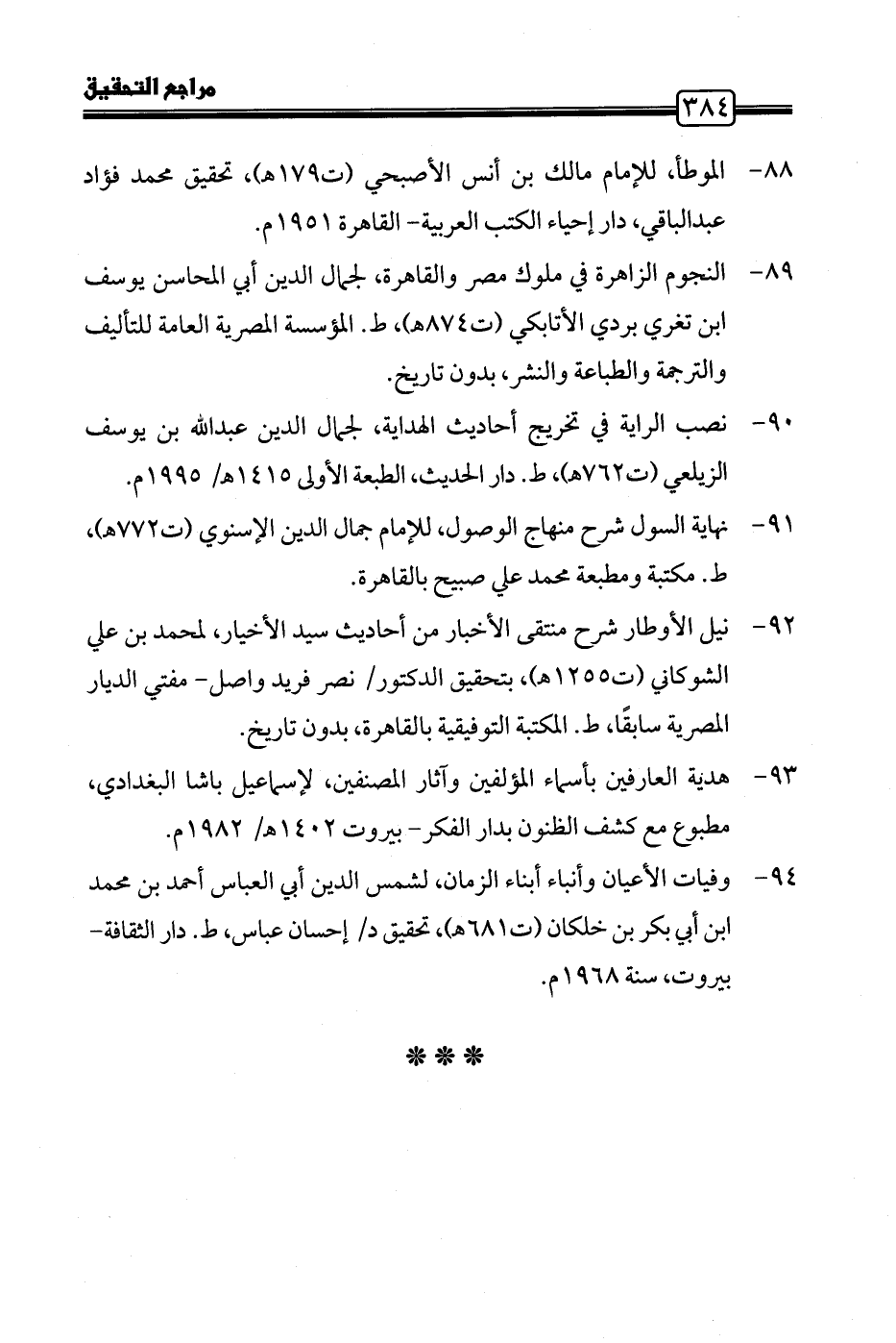 ٨٩ - النجوم الزاهرة في ملوك مصر والقاهرة، لجمال الدين أبي المحاسن يوسف ابن تغري بردي الأتابكي (ت ٨٧٤ هـ)، ط. المؤسسة المصرية العامة للتأليف والترجمة والطباعة والنشر، بدون تاريخ.